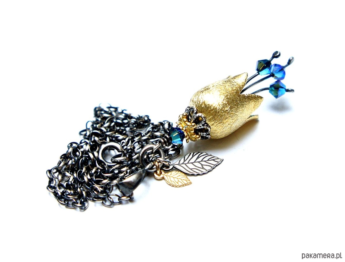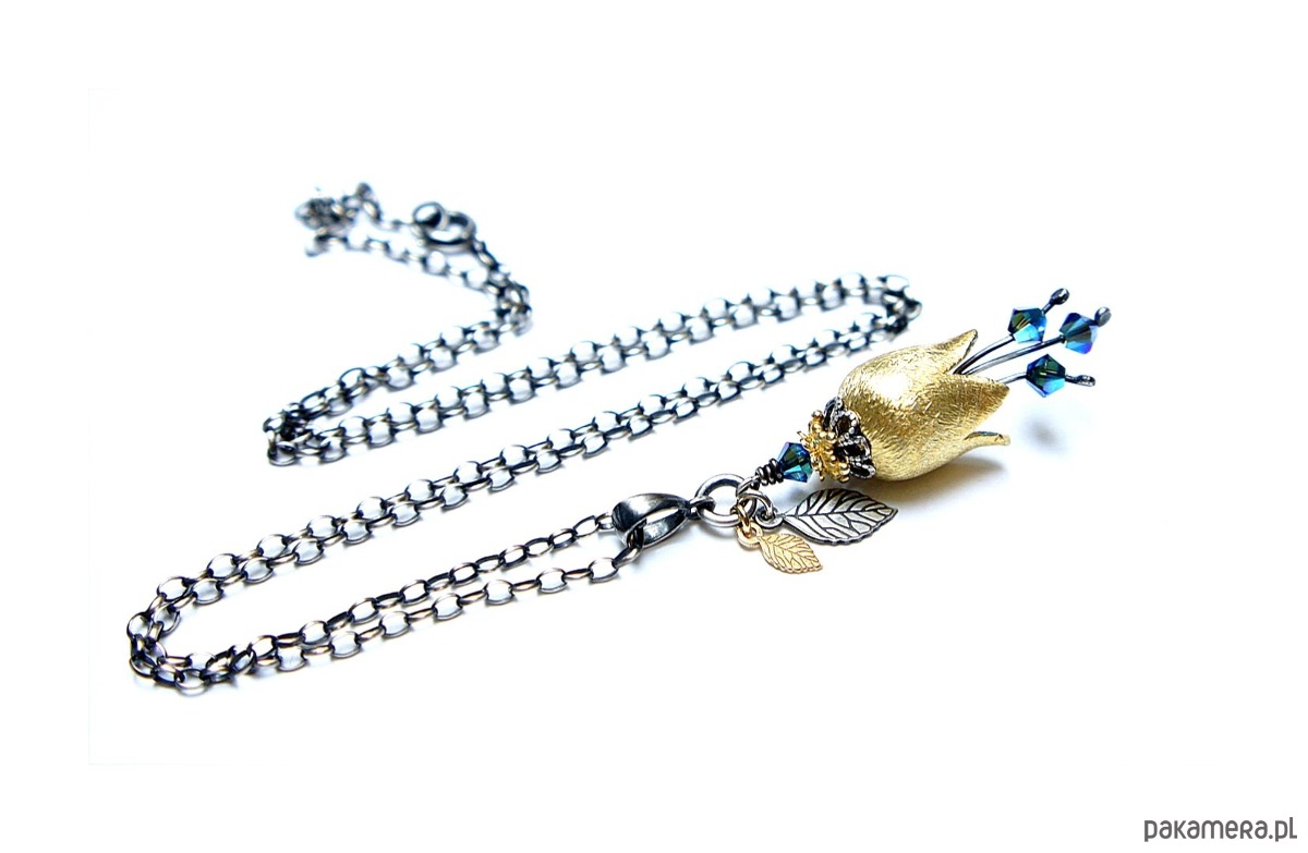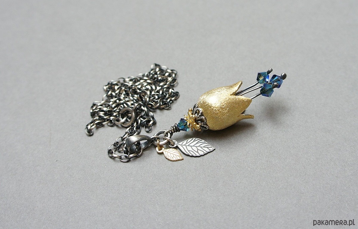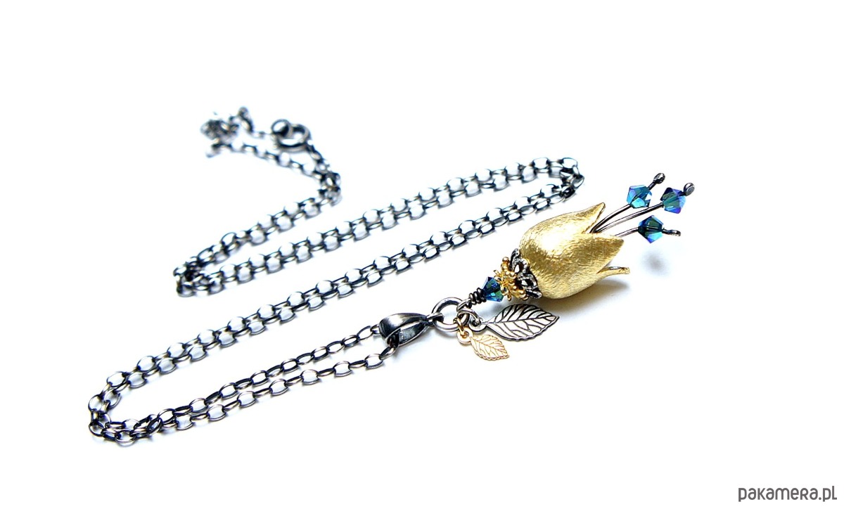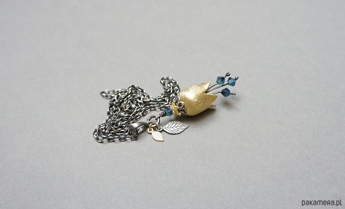 Naszyjnik wykonany ze srebra i srebra pokrytego 24k zlotem [pr. 925] w połączeniu z ręcznie formowanym kielichem kwiatów [18mm], listkami oraz kryształkami Swarovski [4mm]. Srebro częściowo oksydowane i przetarte. Całkowita długość łańcuszka 55cm. Biżuteria ozdobnie zapakowana.
