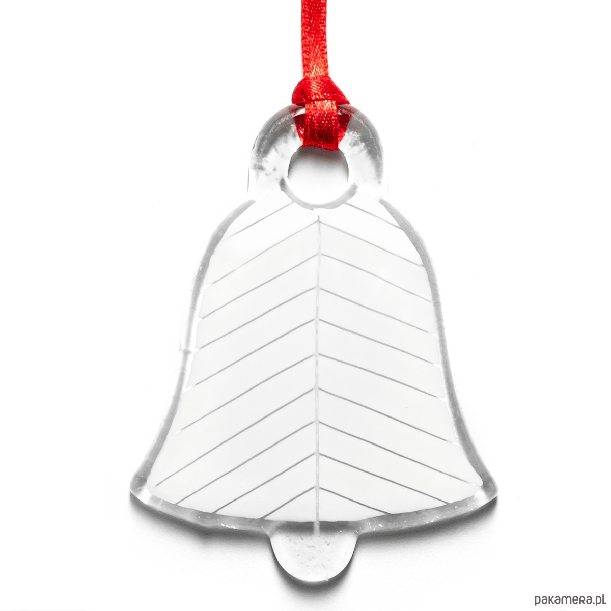 Autorska świąteczna zawieszka na choinkę wykonana ze szkła metodą fusingu. Ozdoba wykonana ze szkła bezbarwnego z ręcznie malowanym i wypalanym wzorem na powierzchni. Spód szkła posiada delikatną fakturę ciekawie odbijającą światło.