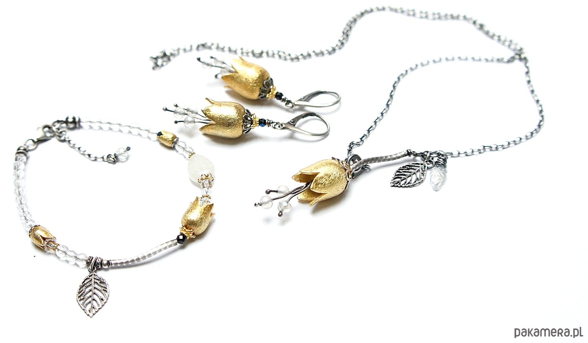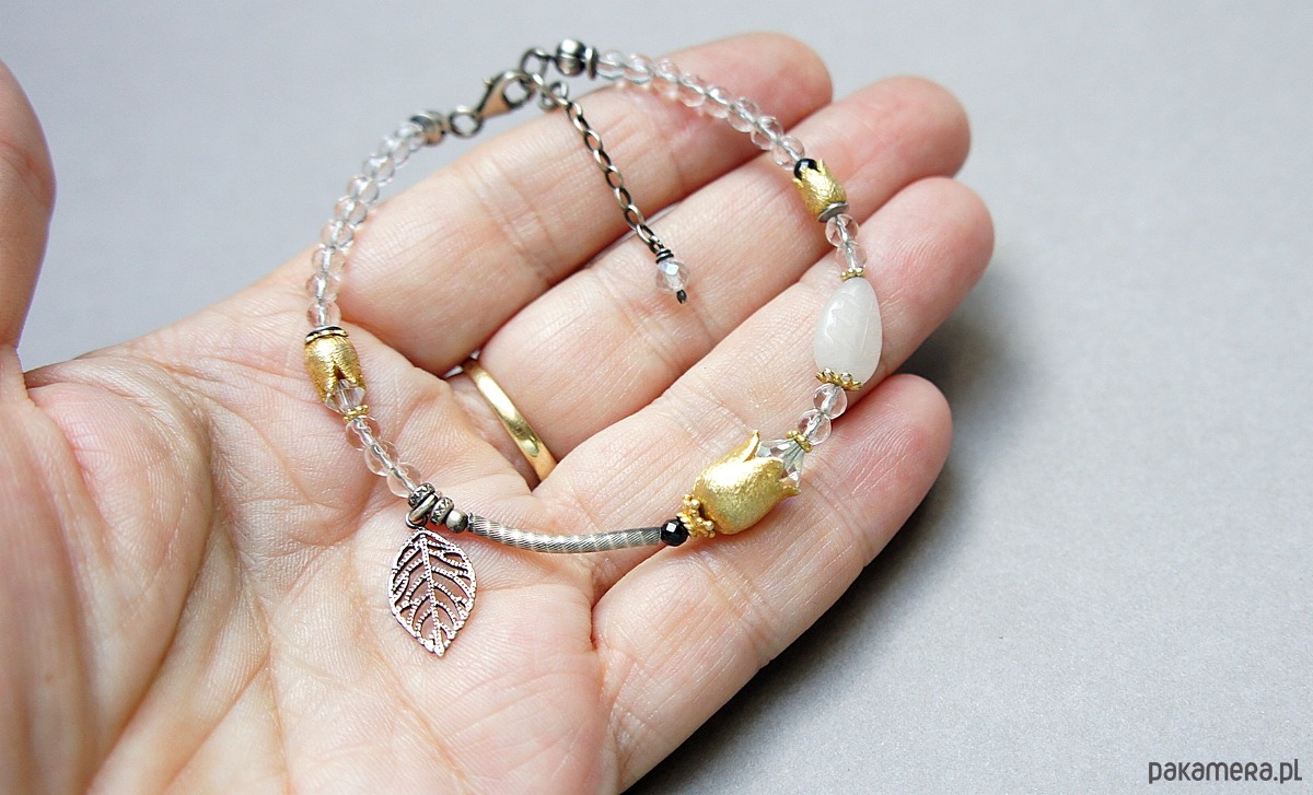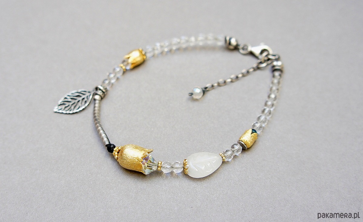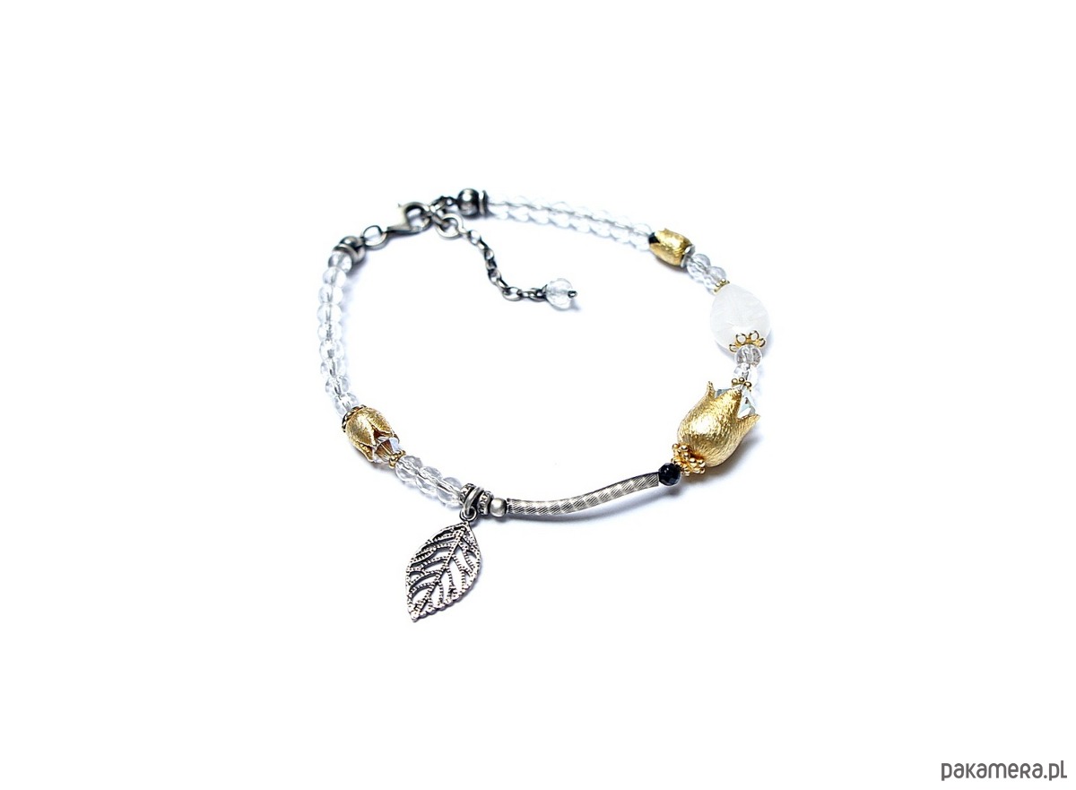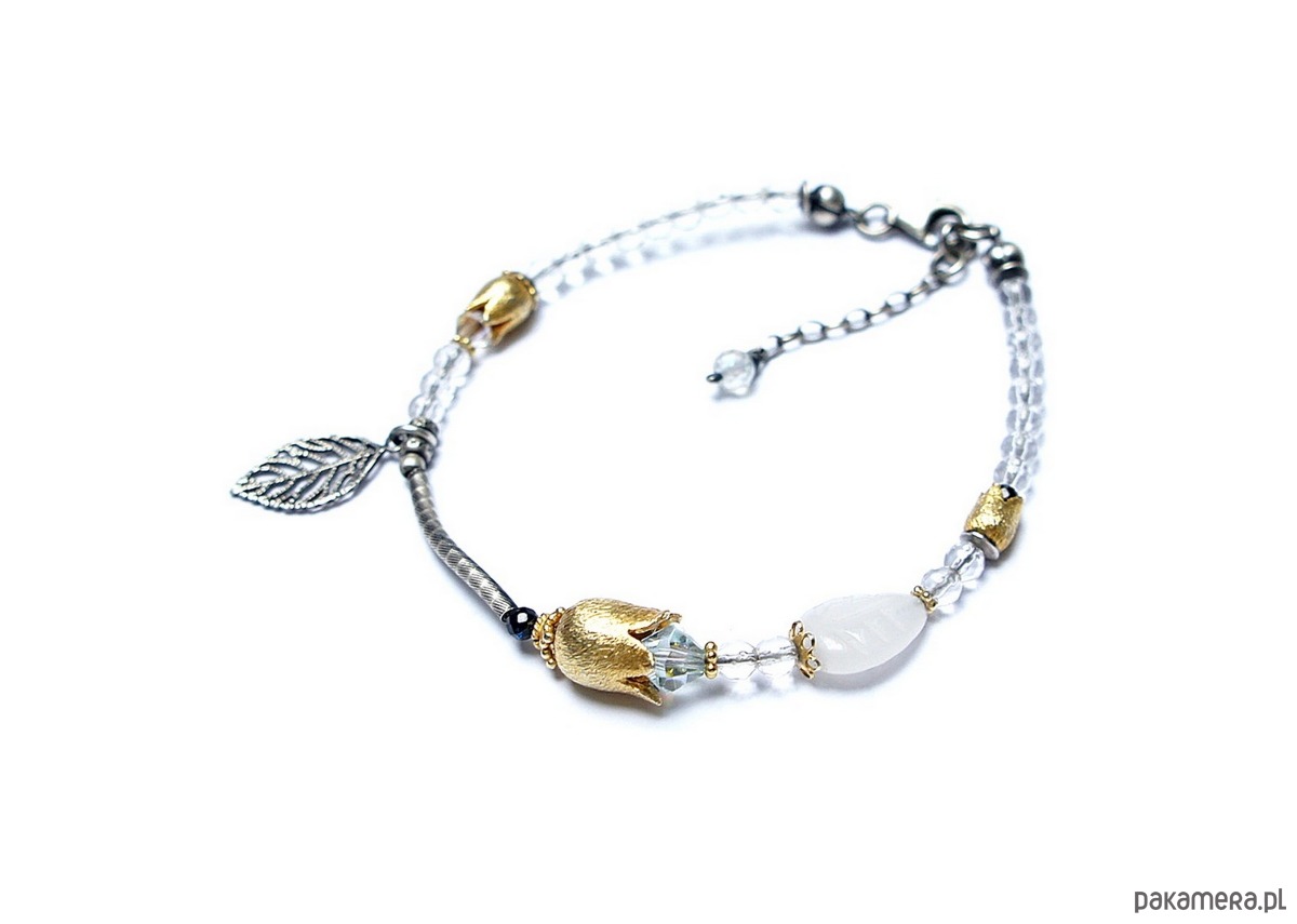 Bransoletka wykonana ze srebra i srebra pokrytego 24kzłotem [pr. 925] w połączeniu z minerałami: fasetowane kuleczki kryształu górskiego [4mm], fasetowane kuleczki spinelu mystic [2mm], listkiem białego agatu [11mm], kryształkami Swarovski [4mm i 6mm] oraz dzwonków [6mm i 10mm]. Srebro częściowo oksydowane i przetarte. Całkowita długość bransoletki 19cm plus ozdobna przedłużka zakończona topazem mystic [4mm]. Biżuteria ozdobnie zapakowana .