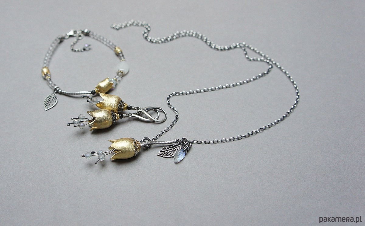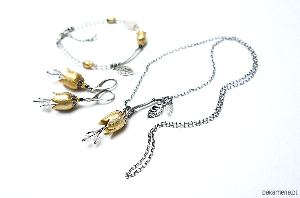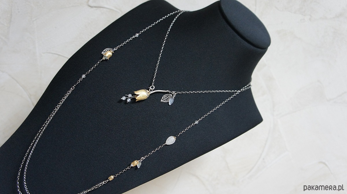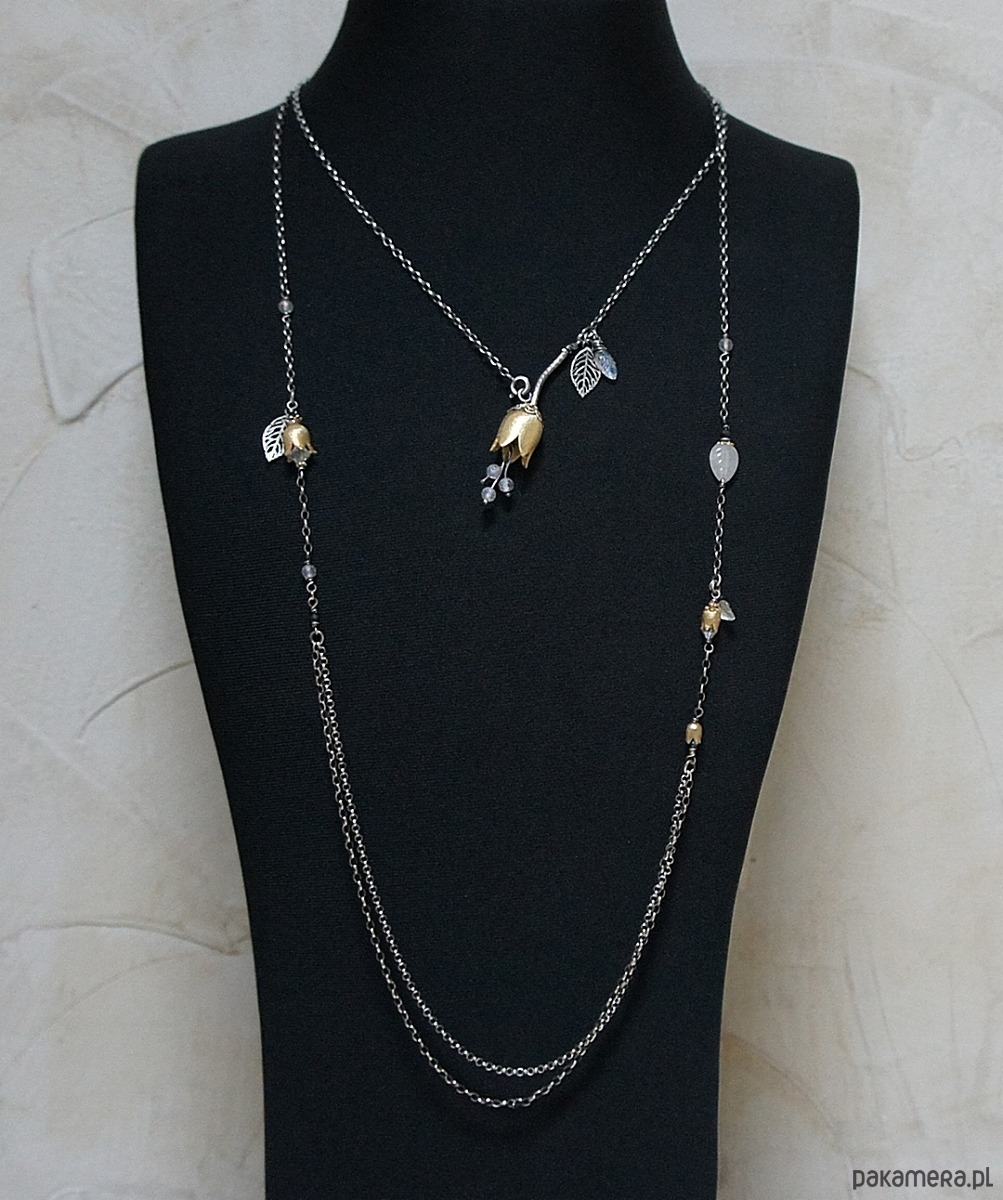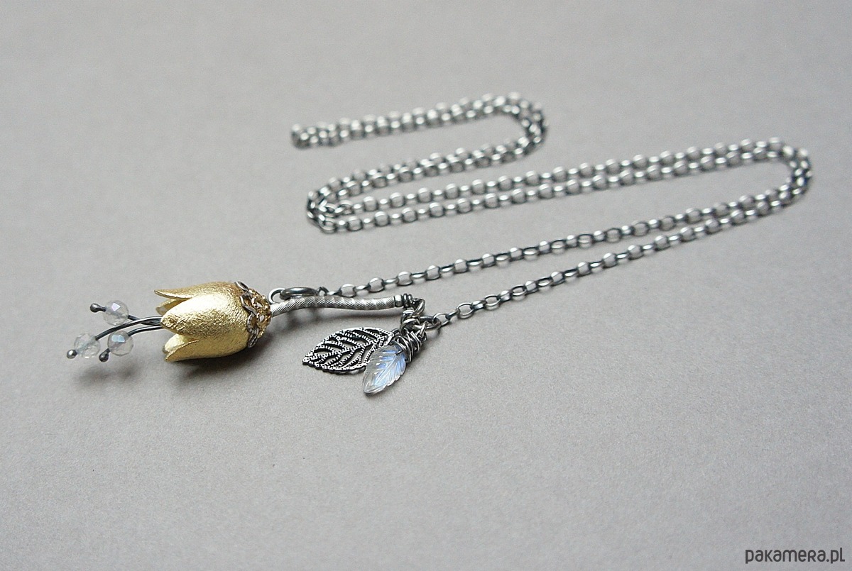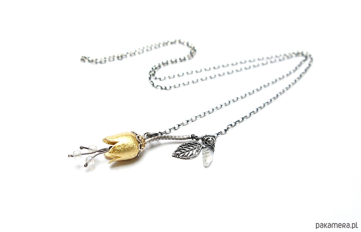 Naszyjnik wykonany ze srebra i srebra pokrytego 24k zlotem [pr. 925] w połączeniu z ręcznie formowanym kielichem kwiatów [16mm], kuleczkami fasetowanych topazów mystic [4mm] oraz rzeźbionym listkiem kamienia księżycowego. Srebro częściowo oksydowane i przetarte. Całkowita długość łańcuszka 55cm. Biżuteria ozdobnie zapakowana.