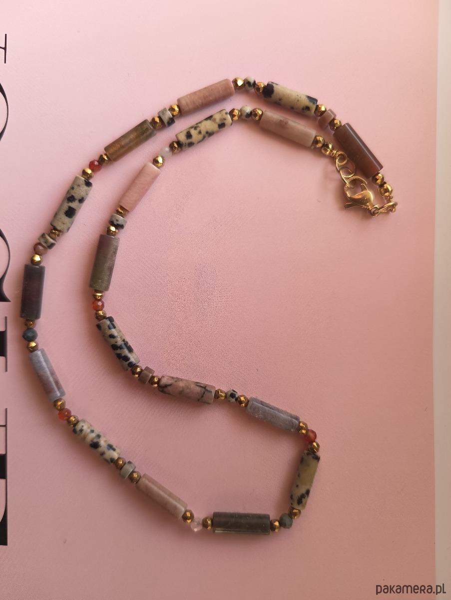 Naszyjnik z naturalnych kamieni na nici jedwabnej i z wykończeniami ze stali chirurgicznej.Dlugość 42cm.