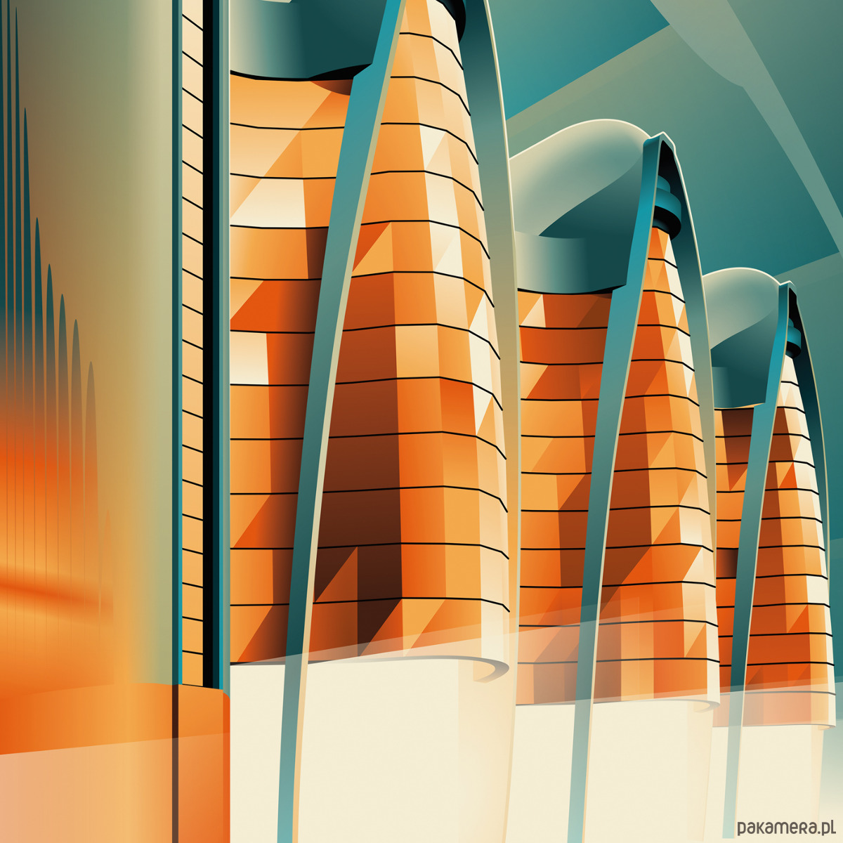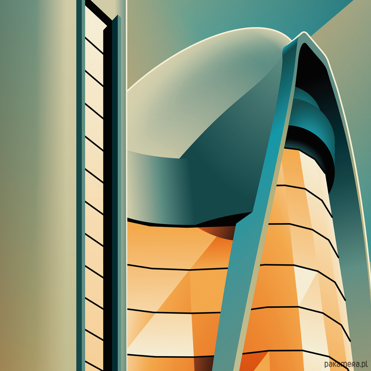Ten wyjątkowy plakat łączy retro-future z eleganckimi liniami art déco, a jego paleta barw – turkus, pomarańcz, beż i złamany biały – nadaje mu wyrazisty, energetyczny charakter.