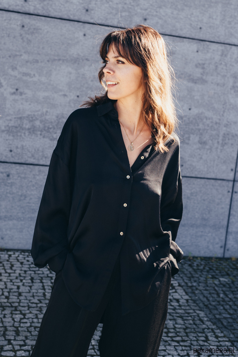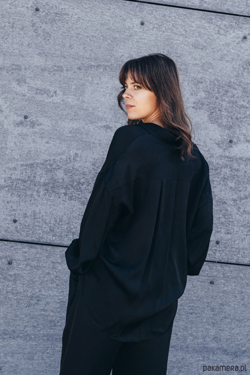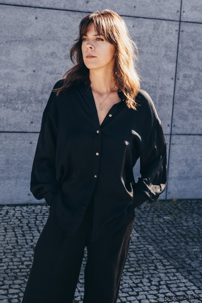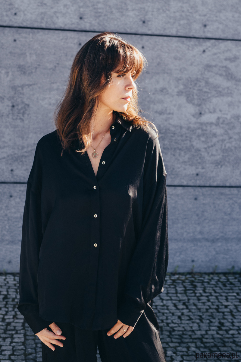 Echo koszula oversize z wiskozowej satyny w kolorze czarnym to doskonały przykład współczesnej klasyki, która łączy w sobie elegancję i komfort. Jej unikalny fason oversize stworzony jest z myślą o swobodzie ruchów, co sprawia, że doskonale sprawdzi się w wielu stylizacjach. Koszula zapinana jest na rząd subtelnych, eleganckich guziczków, a szerokie rękawy zakończone mankietami dodają jej charakteru.