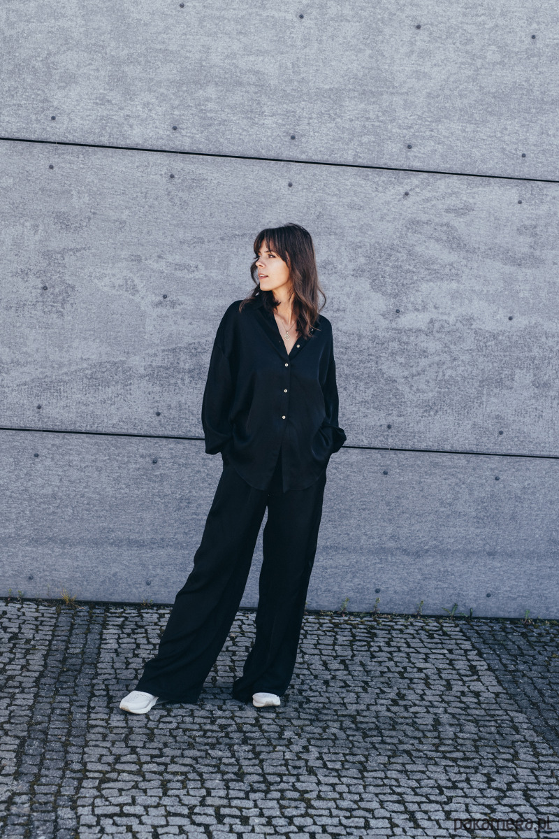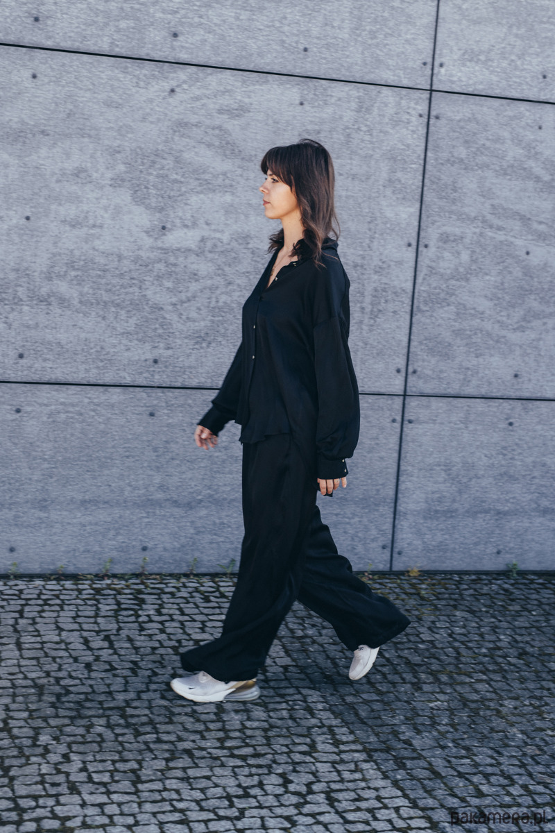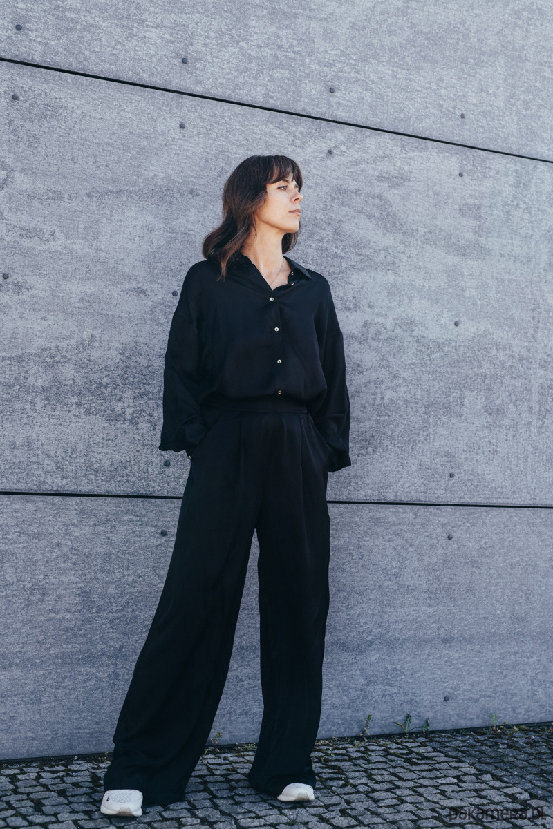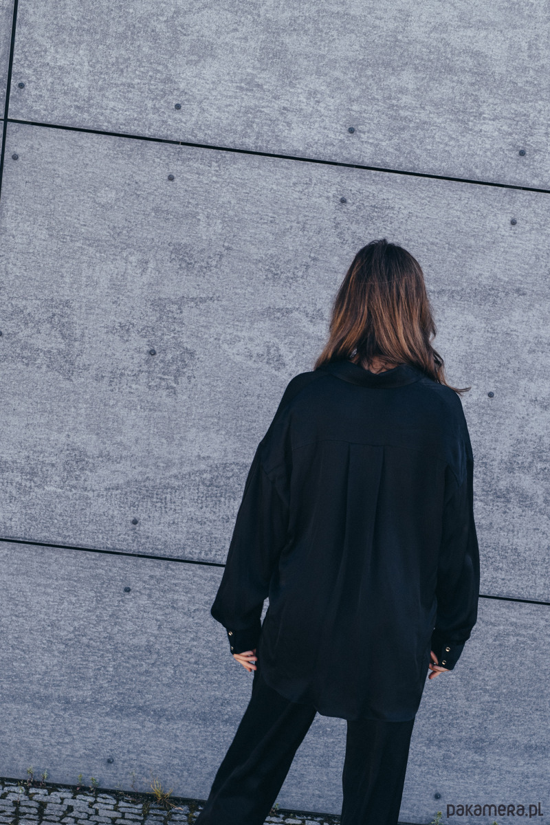 Echo koszula oversize z wiskozowej satyny w kolorze czarnym to doskonały przykład współczesnej klasyki, która łączy w sobie elegancję i komfort. Jej unikalny fason oversize stworzony jest z myślą o swobodzie ruchów, co sprawia, że doskonale sprawdzi się w wielu stylizacjach. Koszula zapinana jest na rząd subtelnych, eleganckich guziczków, a szerokie rękawy zakończone mankietami dodają jej charakteru.