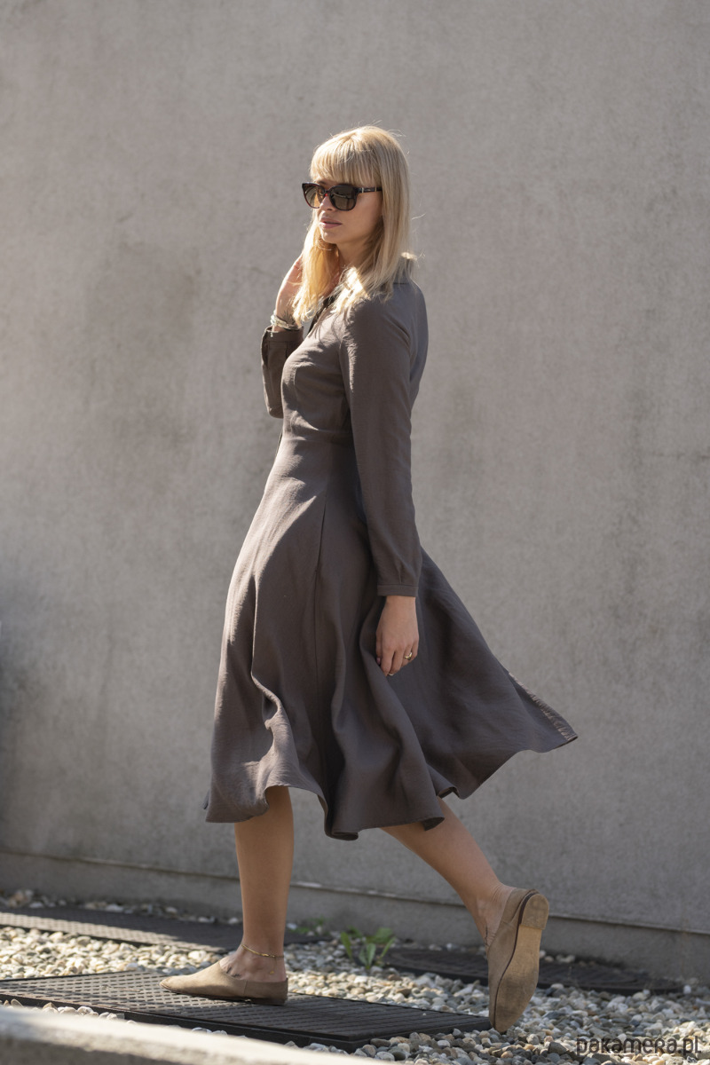 Sukienka midi Echo w kolorze kakao to idealny wybór dla każdej kobiety poszukującej wygody oraz elegancji w codziennych stylizacjach. Charakteryzuje się delikatnie dopasowaną górą, która podkreśla sylwetkę, oraz rozkloszowanym dołem, który swobodnie układa się przy każdym ruchu. Sukienka została zaprojektowana z myślą o praktyczności – ukryte kieszenie w bocznych szwach pozwalają na schowanie drobiazgów lub rozkoszowanie się komfortem wsunięcia rąk. Dodatkowym atutem jest pasek, który umożliwia dowolne stylizowanie sukienki – możesz nosić ją luzem dla swobodnego wyglądu lub z podkreśloną talią dla bardziej eleganckiego efektu. Wykonana z matowej, przyjemnej w dotyku tkaniny wiskozowej, sukienka idealnie sprawdzi się zarówno na co dzień, jak i podczas wyjątkowych okazji. Ciepły odcień kakao nadaje całości naturalnego uroku, a niezwykła miękkość materiału sprawia, że sukienka towarzyszy Ci od porannej kawy po wieczorne spotkania.