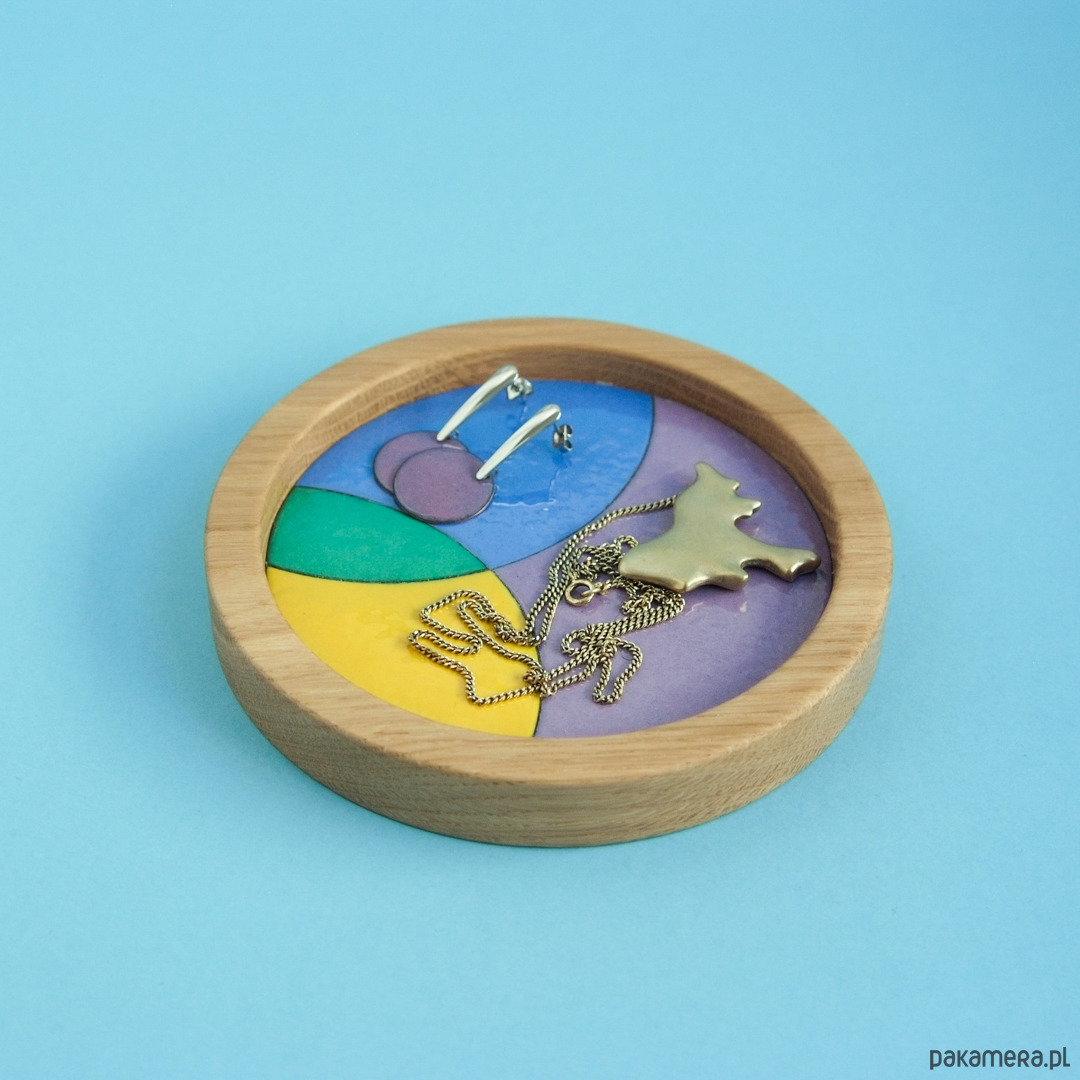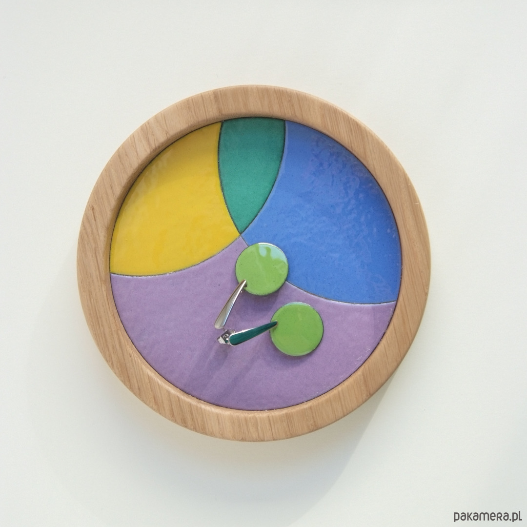 Tackę na biżuterię ECLIPSE wykonałyśmy ręcznie w technice emalierskiej. Mozaikę tworzą blaszki miedziane z wypalonym na niej szkliwem.