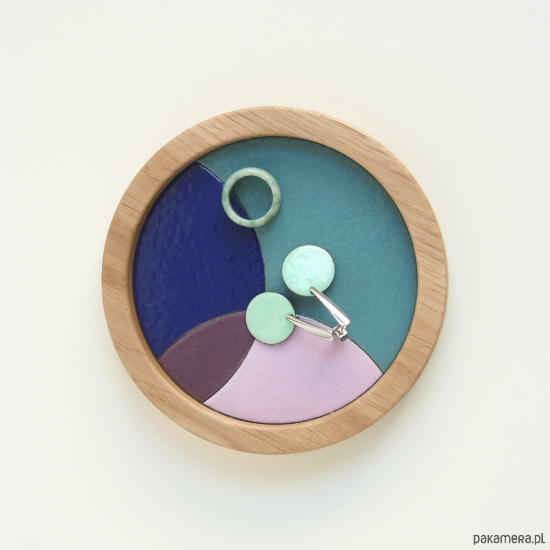 Tackę na biżuterię ECLIPSE wykonałyśmy ręcznie w technice emalierskiej. Mozaikę tworzą blaszki miedziane z wypalonym na niej szkliwem.