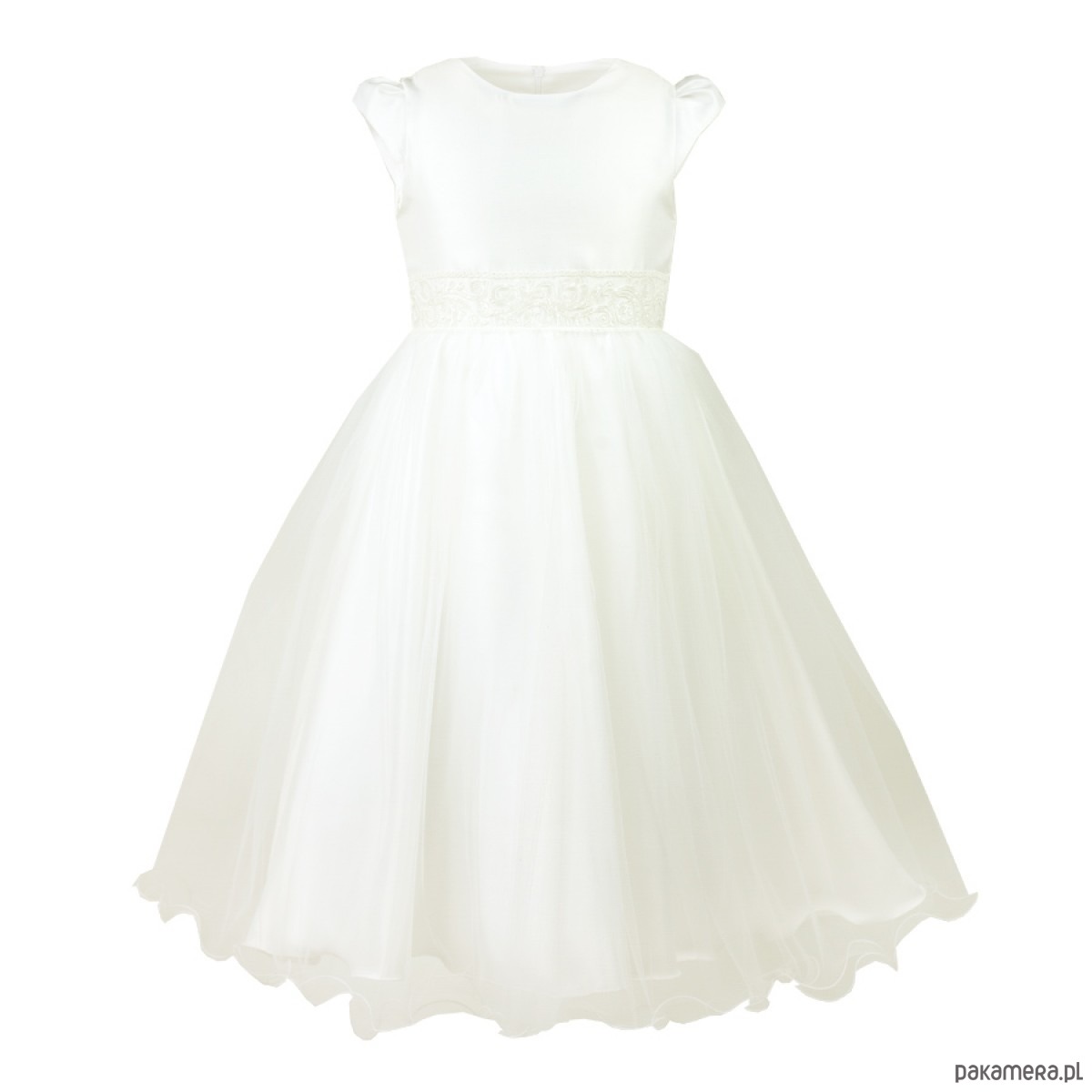 Efektowna suknia na najważniejsze uroczystości. Góra sukienki wykonana została z półmatowej tkaniny z delikatnymi rękawkami. W pasie ozdobiona delikatnym haftem koronkowym. Dół wykonany jest z 4 warstw dzięki temu sukienka wygląda niezwykle efektownie. Dwie górne warstwy to tiul, usztywniany żyłką na dole. Pod spodem znajduję się atłas i lekka podszewka z acetatu. Z tyłu wszyty elegancki kryty zamek. Sukienka może zostać wykorzystana jako przebranie po I Komunii Świętej, na wesele lub inne ważne okoliczności.