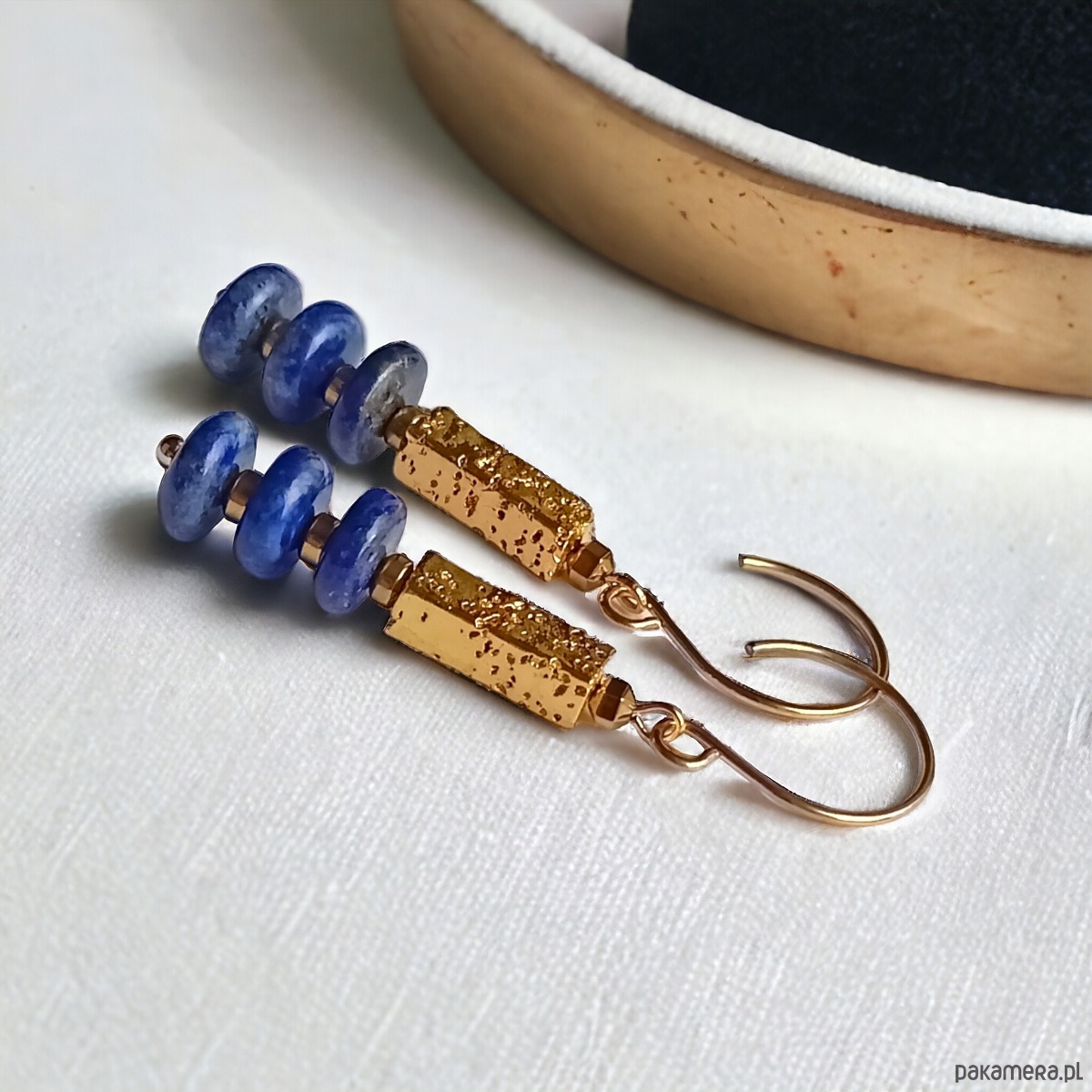 Okazałe, bardzo efektowne kolczyki wykonane z plasterków lapis lazuli, złotej lawy wulkanicznej i złotego hematytu.