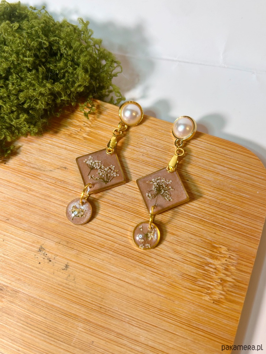 Kto powiedział, że biżuteria botaniczna musi być tradycyjna? Te kolczyki to połączenie nowoczesnych, rombowych form z klasycznym blaskiem perły. Wewnątrz szlachetnego beżu zamknęliśmy najdelikatniejsze baldaszki dzikiej marchwi.