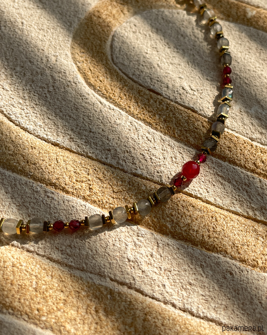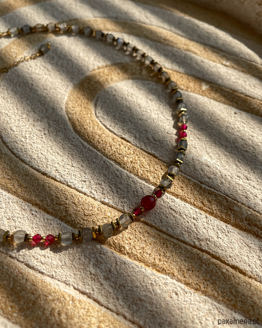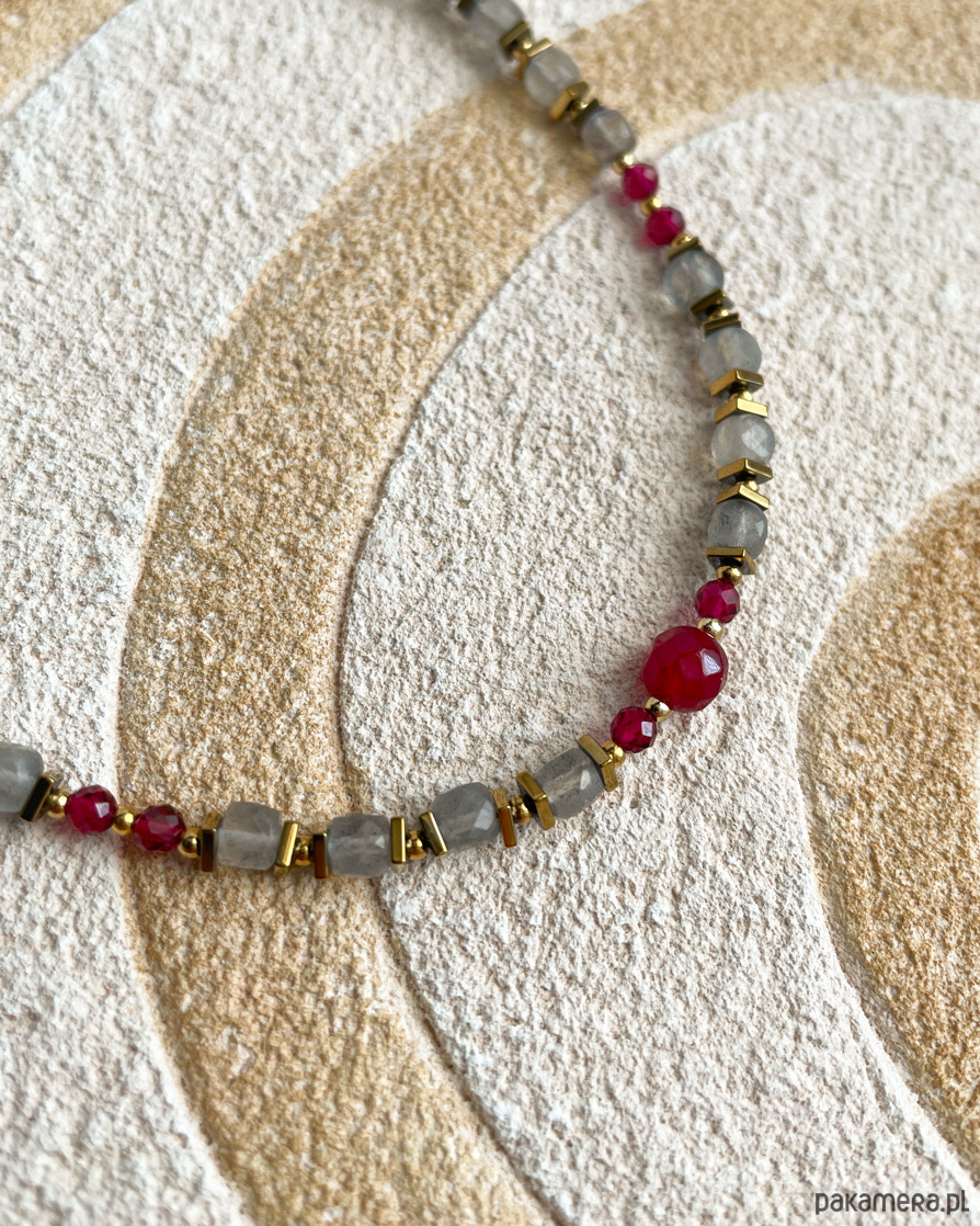 Niezwykle efektowny i pięknie mieniący się naszyjnik (choker) z kostek LABRADORYTU i złotego HEMATYTU. Ozdobne elementy to małe, fasetowane RUBINY syntetyczne i duży JADEIT (kamień na środku naszyjnika).