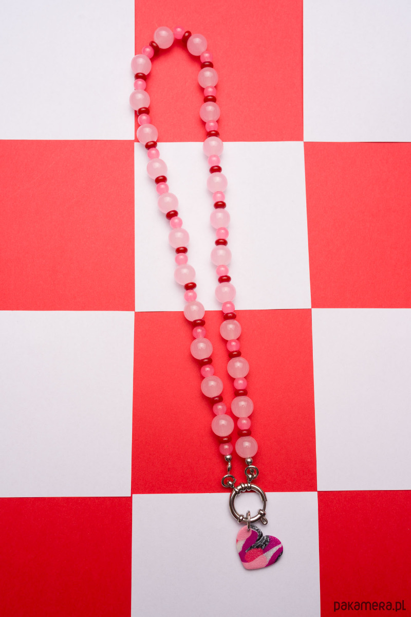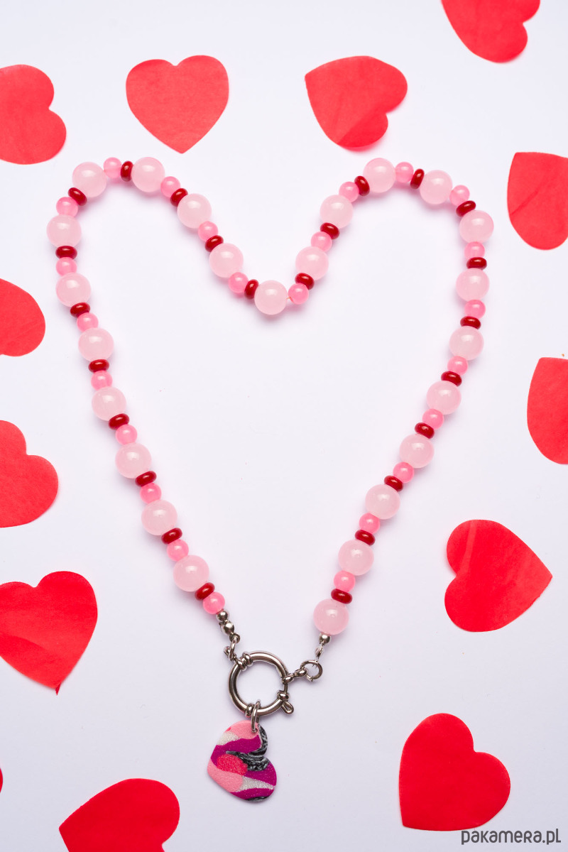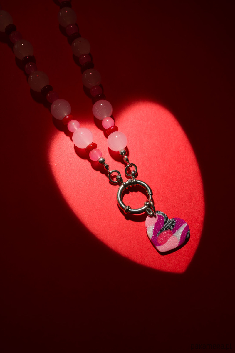 Naszyjnik jest współczesną odpowiedzią na dawne dewizki od zegarków kieszonkowych. Jest wykonany z koralików szklanych oraz stali chirurgicznej. Zawieszka serce wykonana z gliny polimerowej.