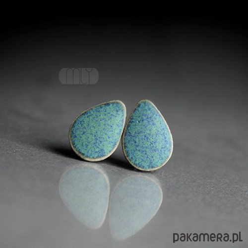 Ceramiczne kolczyki w formie sztyftów, ręcznie wykonane z delikatnej czekoladowobrązowej gliny kamionkowej, jednostronnie szkliwione mieszanką zielonych i błękitnych szkliw z efektem plamek, na antyalergicznych sztyftach w kolorze srebrnym. Długość ok. 13mm. Polecam