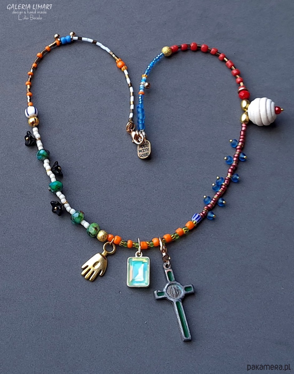 Uroczy oryginalny naszyjnik z mnóstwa drobnych przeróżnych, starannie dobranych, szklanych koralików (seed beads), starego metalowego krzyżyka, oprawionego syntetycznego opalu, drewna, pereł, metali, etc (vide foto), dodatkowo ozdobiony ręką Fatimy na szczęście.