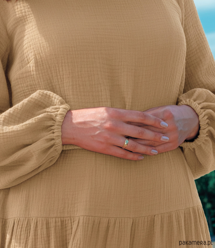 Jej długi krój odsłania tylko lekko kostki, co dodaje jej subtelnego uroku i elegancji. Luźny krój i długie rękawy zapewniają wygodę i swobodę ruchów, a okrągły dekolt podkreśla szyję i nadaje całości kobiecego, romantycznego wyglądu. Sukienka idealnie wygląda z paskiem w eko stylu ze skóry ekologicznej. Romantyczna sukienka muślinowa z pewnością przyciągnie uwagę i pozwoli poczuć się niezwykle atrakcyjnie każdej kobiecie, która ją założy.