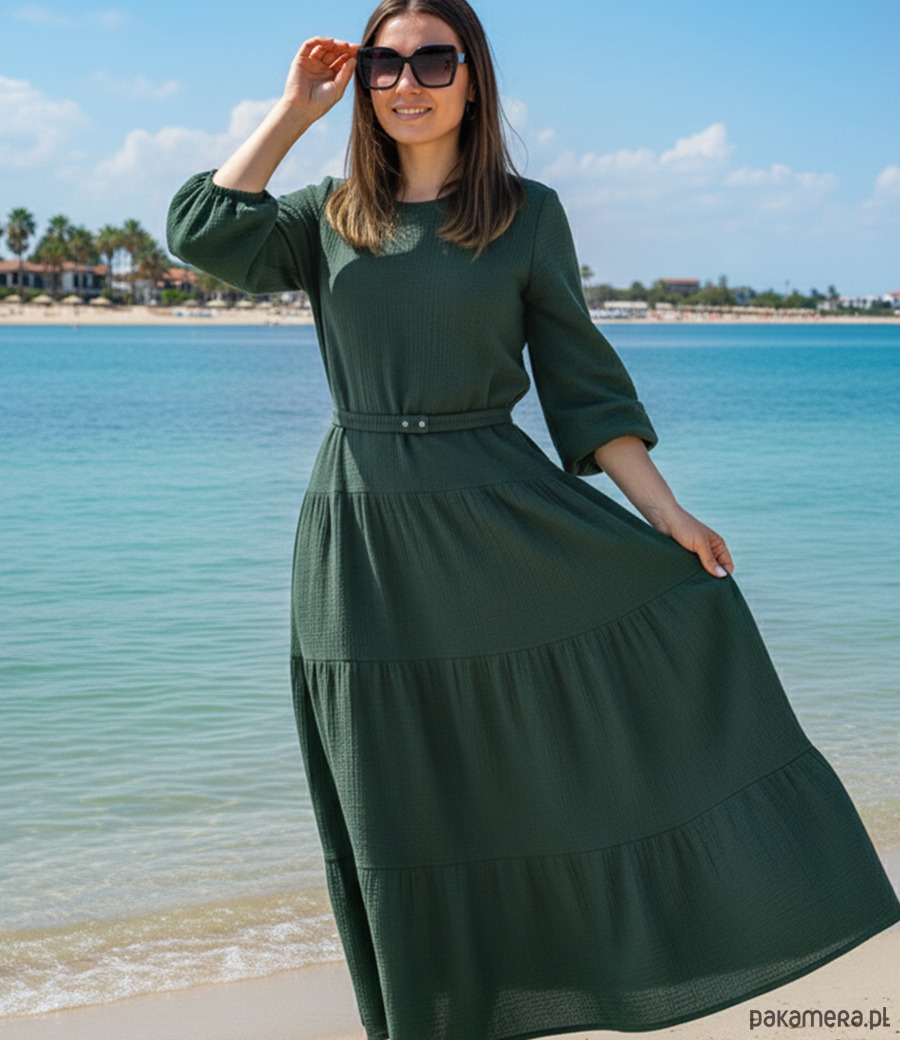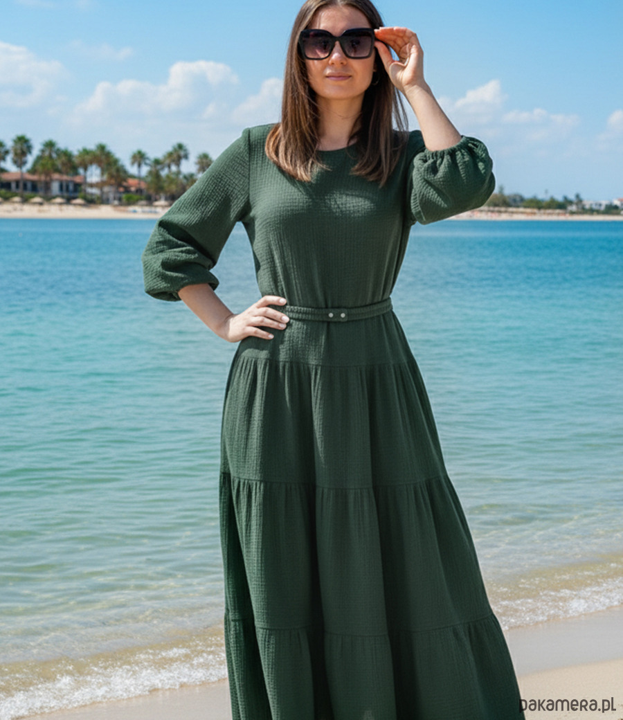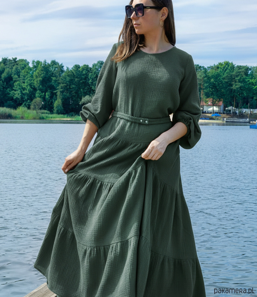 Jej długi krój odsłania tylko lekko kostki, co dodaje jej subtelnego uroku i elegancji. Luźny krój i długie rękawy zapewniają wygodę i swobodę ruchów, a okrągły dekolt podkreśla szyję i nadaje całości kobiecego, romantycznego wyglądu. Sukienka idealnie wygląda z paskiem w eko stylu ze skóry ekologicznej. Romantyczna sukienka muślinowa z pewnością przyciągnie uwagę i pozwoli poczuć się niezwykle atrakcyjnie każdej kobiecie, która ją założy.