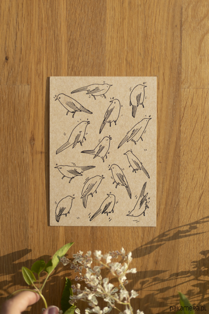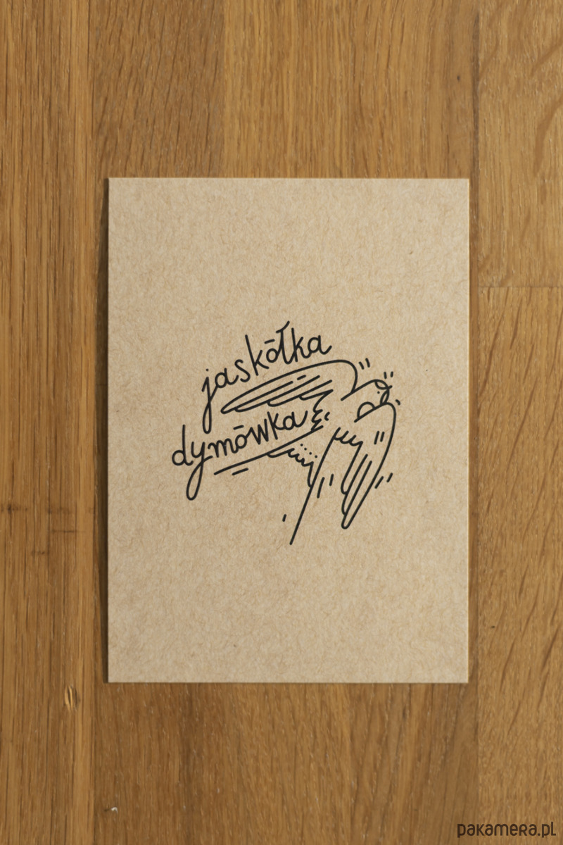 Minimalistyczny print pocztówkowy z ilustracją, wydrukowany brązowym na papierze ekologicznym.