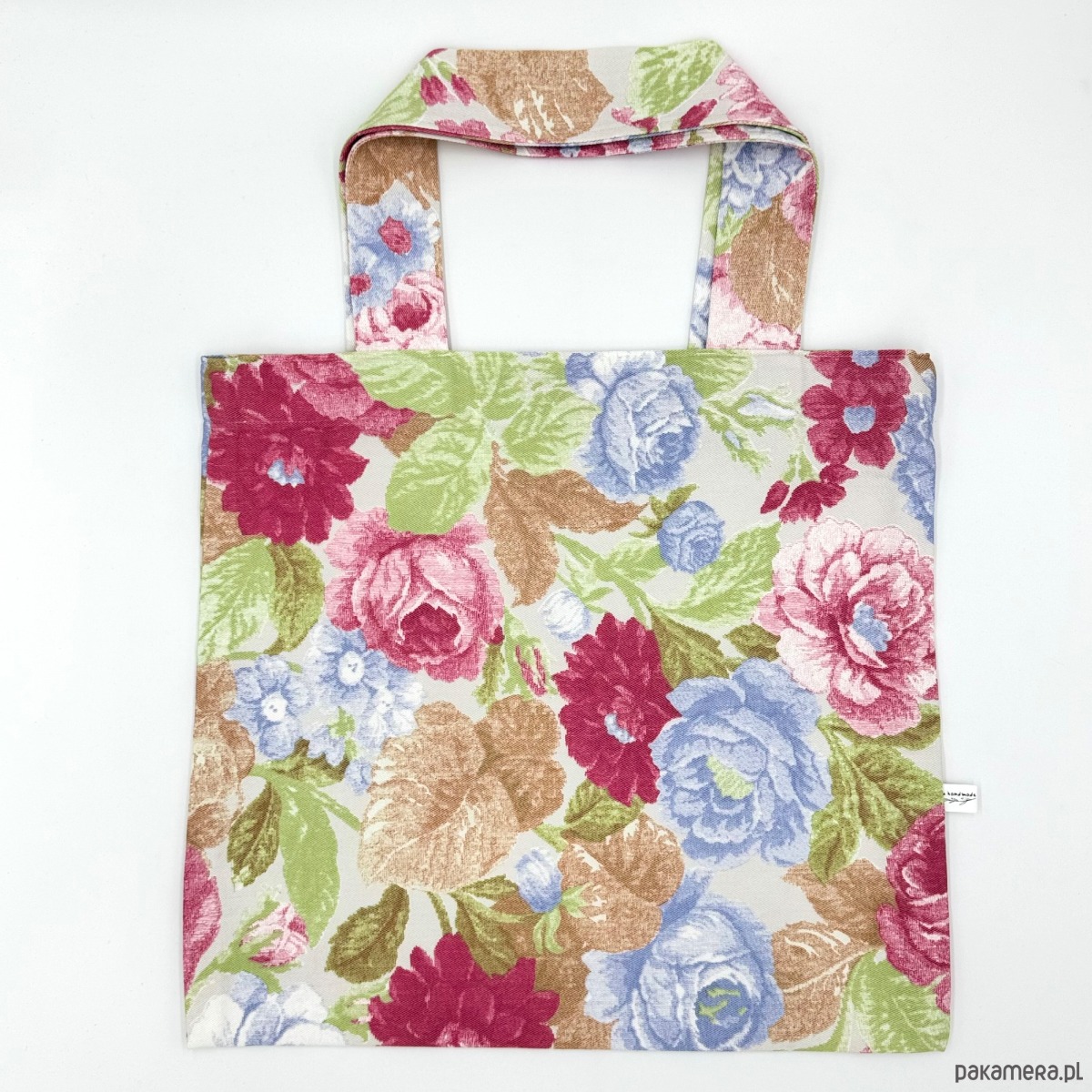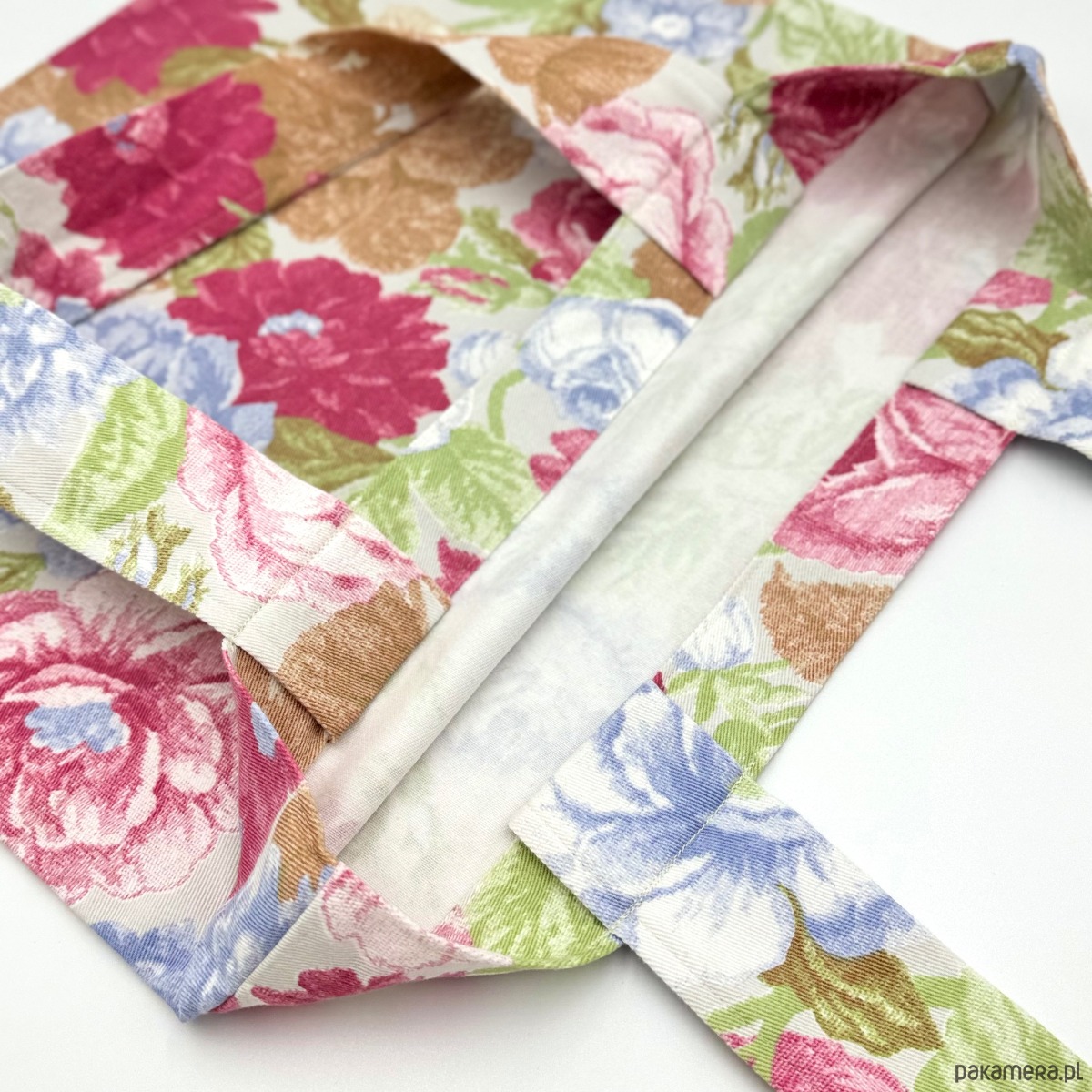 Eko torba uszyta z grubego drelichu bawełnianego w jasnych kolorach w kolorowe kwiaty.
