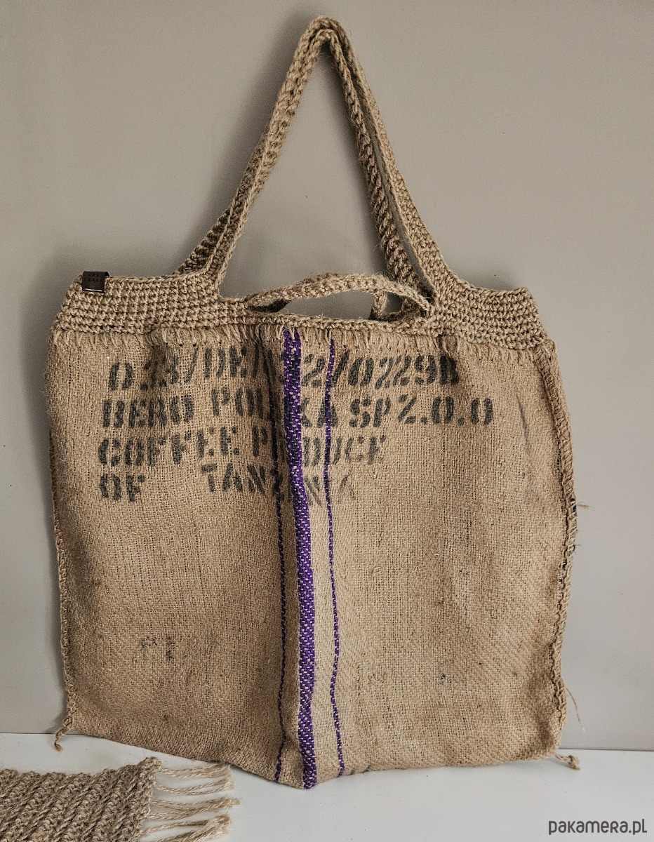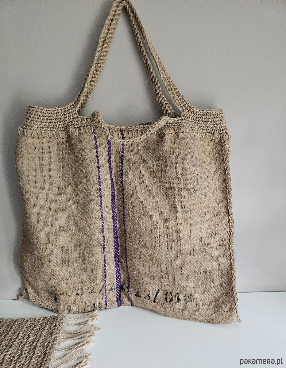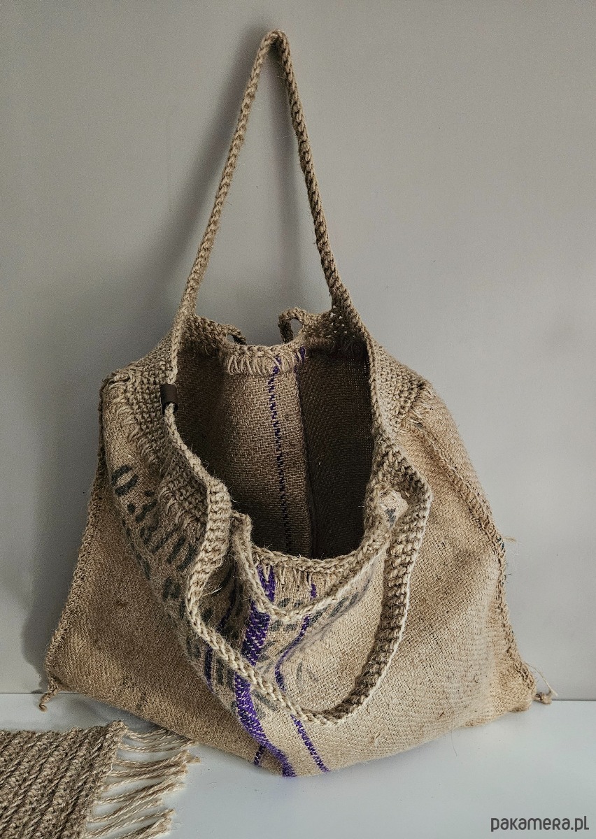 Torba z duszą i historią — uszyta z prawdziwego worka po kawie, ozdobiona ręcznie szydełkowanym wykończeniem ze sznurka konopnego.