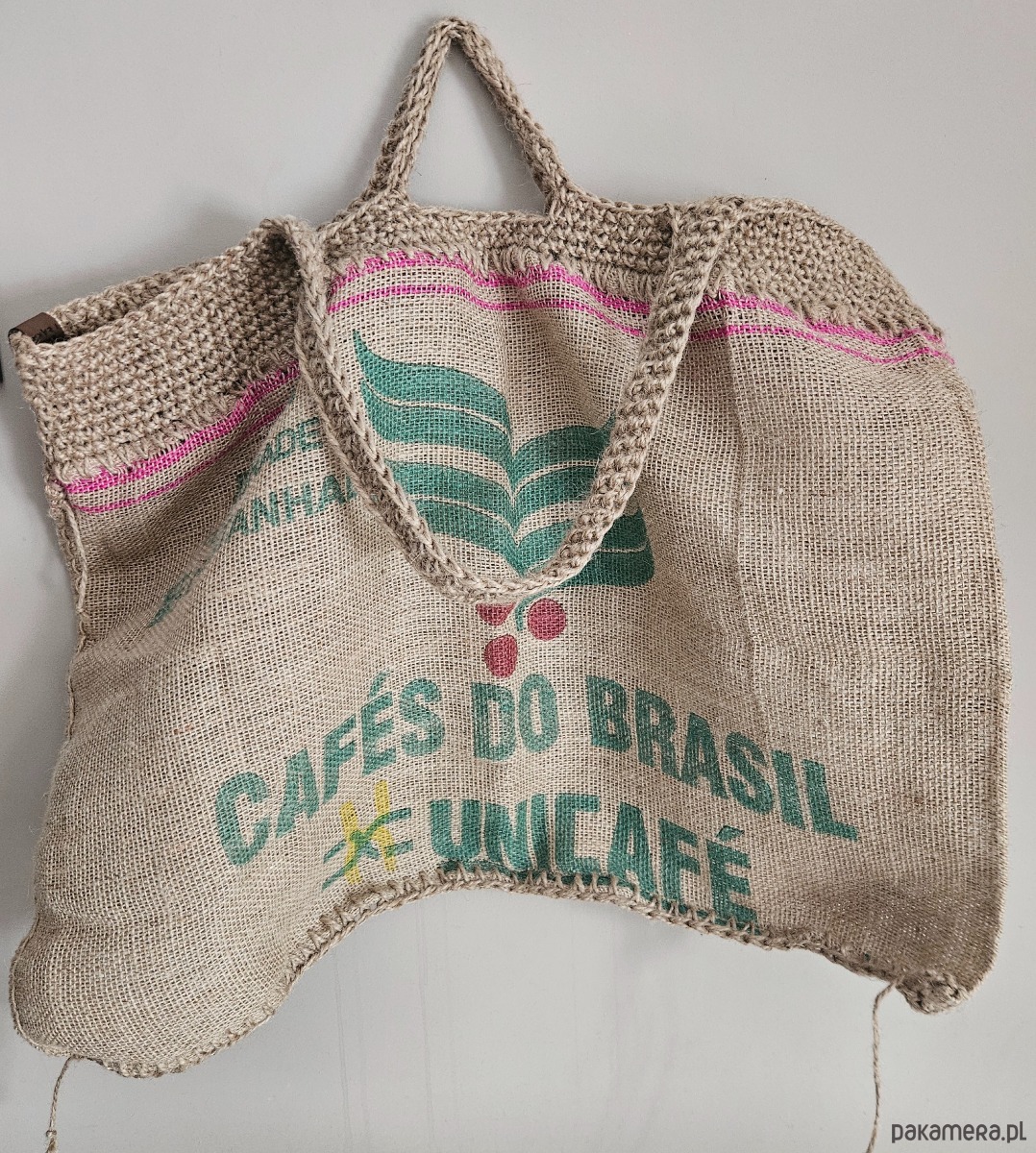 Torba z duszą i historią — uszyta z prawdziwego worka po kawie, ozdobiona ręcznie szydełkowanym wykończeniem ze sznurka konopnego.