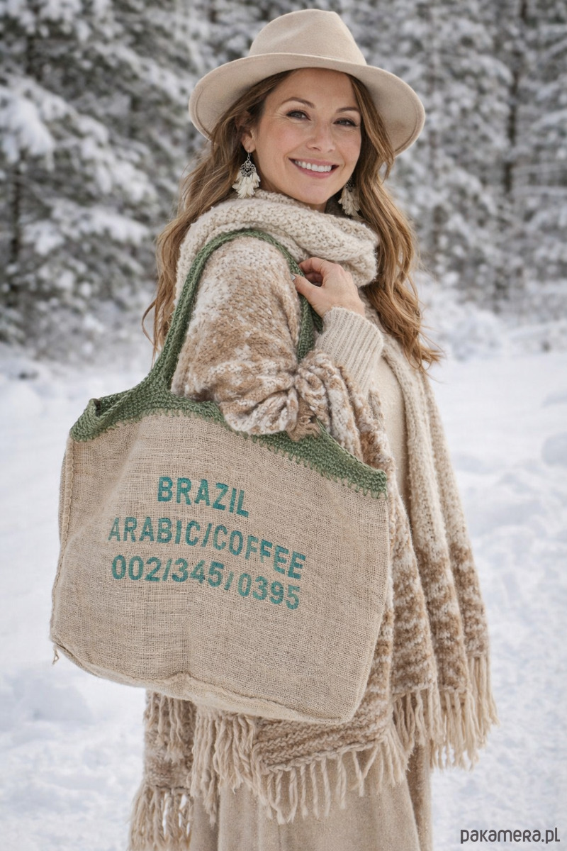 Torba z duszą i historią — uszyta z prawdziwego worka po kawie, ozdobiona ręcznie szydełkowanym wykończeniem ze sznurka konopnego.