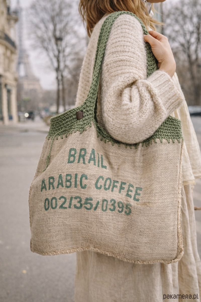 Torba z duszą i historią — uszyta z prawdziwego worka po kawie, ozdobiona ręcznie szydełkowanym wykończeniem ze sznurka konopnego.