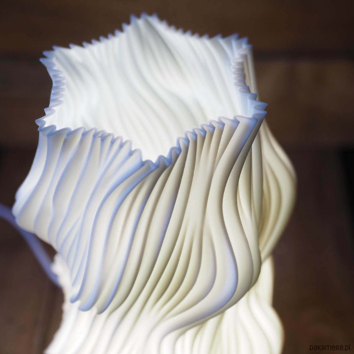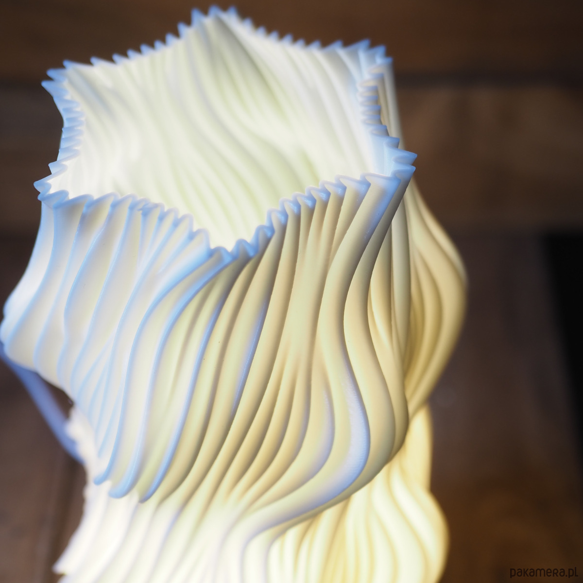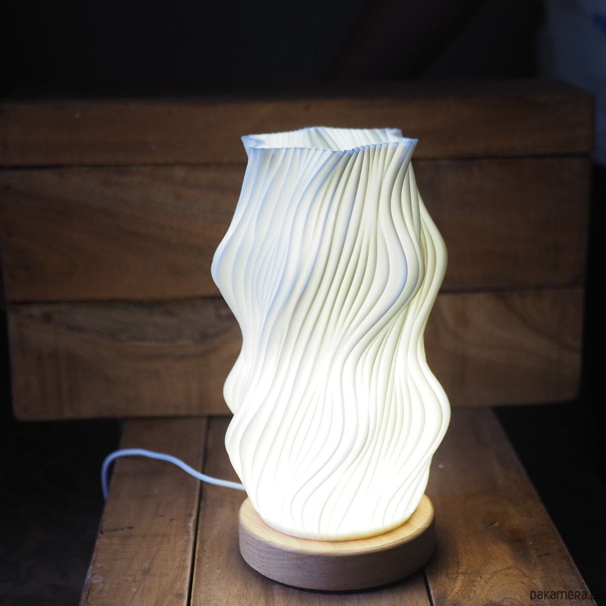 Lampa jest efektem połączenia nowoczesnej technologii druku 3D z dbałością o środowisko. Klosz wykonany jest z biodegradowalnego plastiku PLA (z kukurydzy!), co czyni ją wyborem przyjaznym dla planety. Drewniana podstawa wprowadza ciepło i stabilność, idealnie uzupełniając płynne formy klosza.