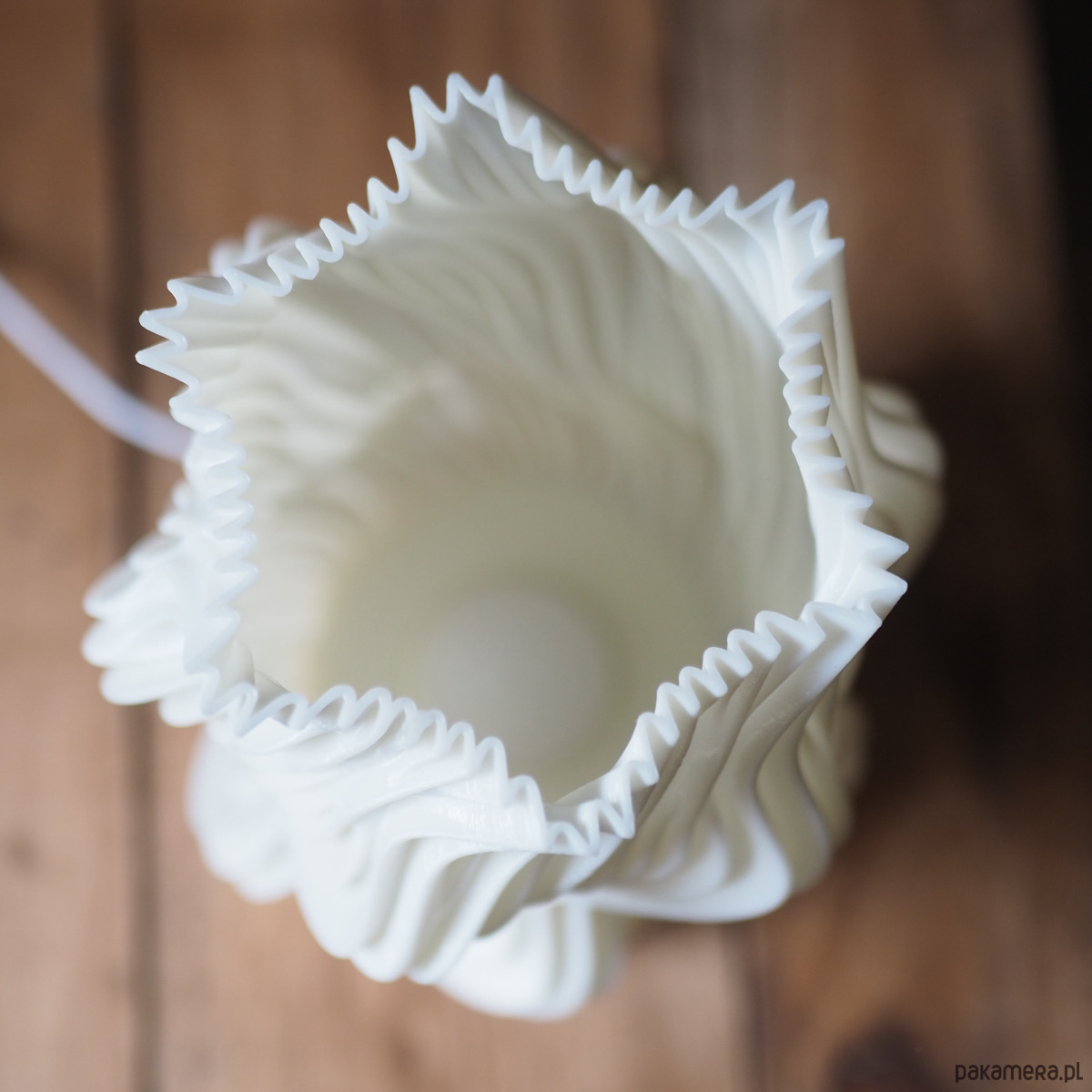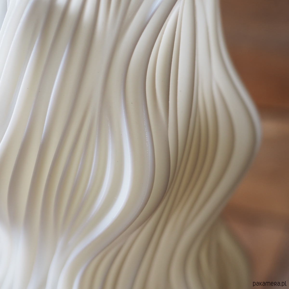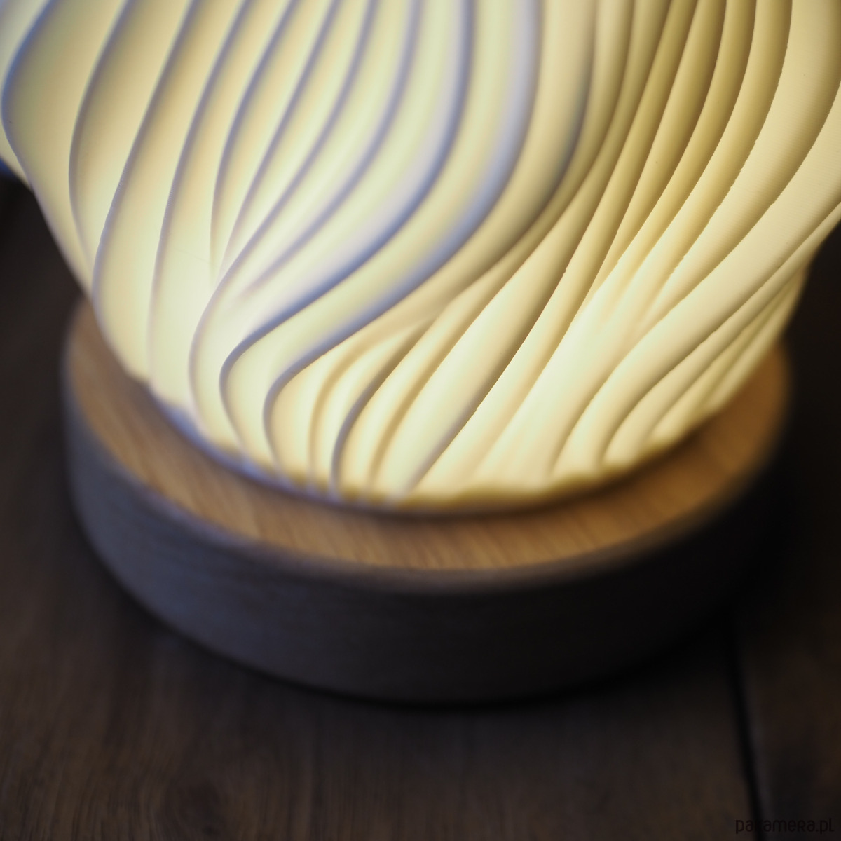 Lampa jest efektem połączenia nowoczesnej technologii druku 3D z dbałością o środowisko. Klosz wykonany jest z biodegradowalnego plastiku PLA (z kukurydzy!), co czyni ją wyborem przyjaznym dla planety. Drewniana podstawa wprowadza ciepło i stabilność, idealnie uzupełniając płynne formy klosza.