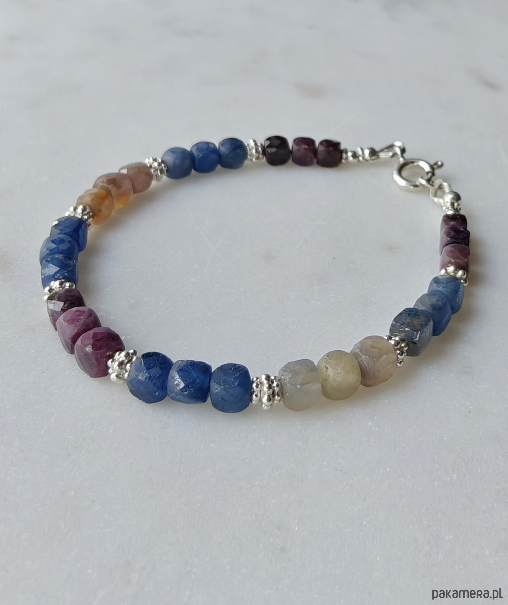 Bransoletka idealna na prezent dla kogoś bliskiego sercu. Została wykonana z pięknych szafirów w dwóch kolorach oraz głęboko nasyconych rubinów. Bogato ozdobiona srebrnymi dodatkami. Ekskluzywna bransoletka.