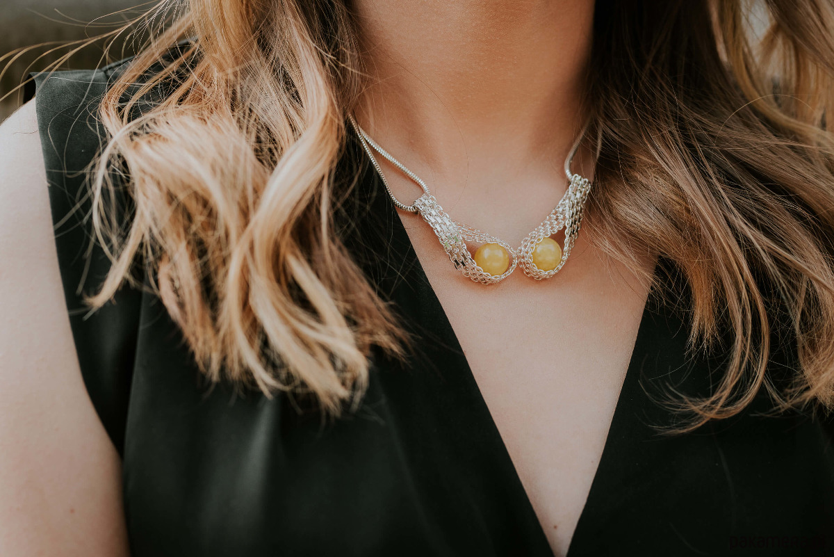 Krótka bardzo elegancka kolia wykonana ze srebra próby 925 i bursztynowych kulek. Kolia bazuje na dwóch rodzajach grubego srebrnego łańcuszka, a w jej centrum znajdują się duże kulki bursztynu bałtyckiego. Bursztyn jest w pięknym jasnożółtym odcieniu, tzw. mleczny bursztyn. Ta kolia to nowoczesna bursztynowa biżuteria, którą się wyróżnisz!
