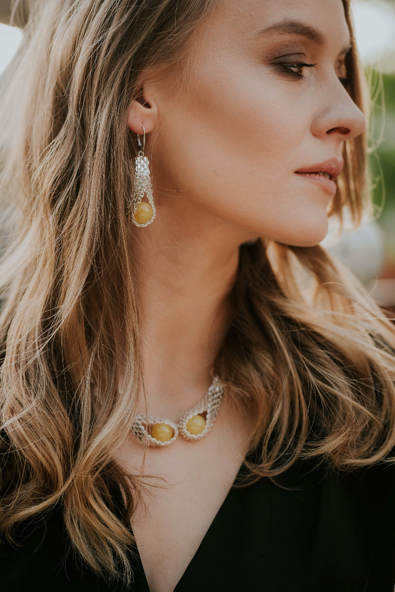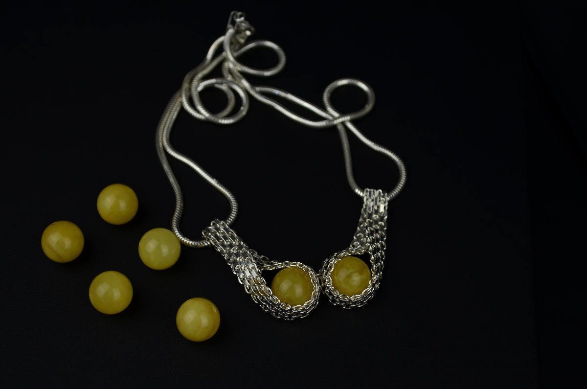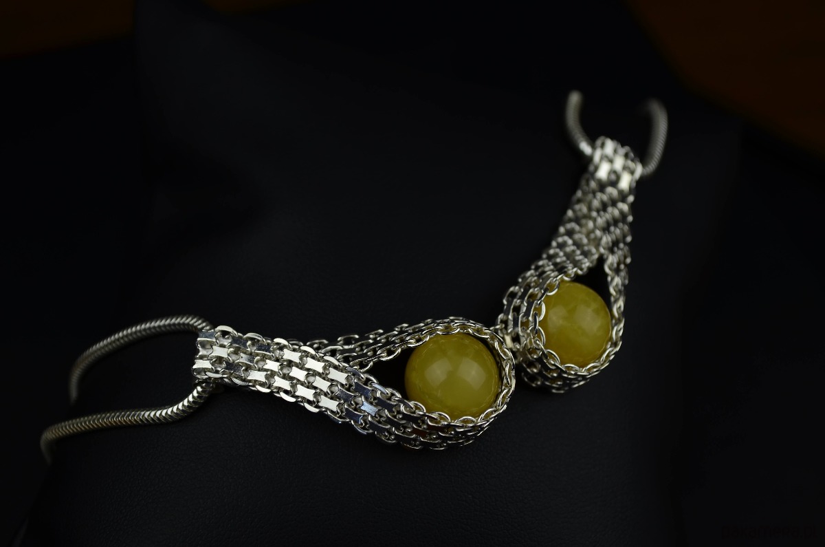 Krótka bardzo elegancka kolia wykonana ze srebra próby 925 i bursztynowych kulek. Kolia bazuje na dwóch rodzajach grubego srebrnego łańcuszka, a w jej centrum znajdują się duże kulki bursztynu bałtyckiego. Bursztyn jest w pięknym jasnożółtym odcieniu, tzw. mleczny bursztyn. Ta kolia to nowoczesna bursztynowa biżuteria, którą się wyróżnisz!