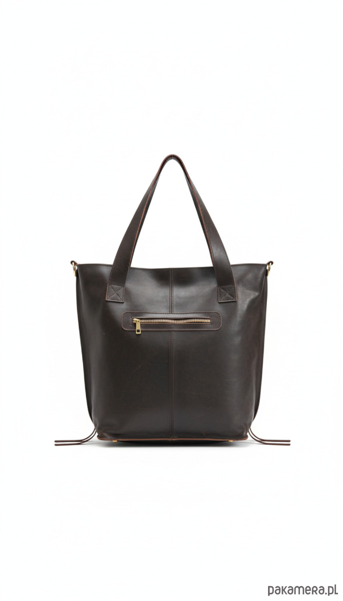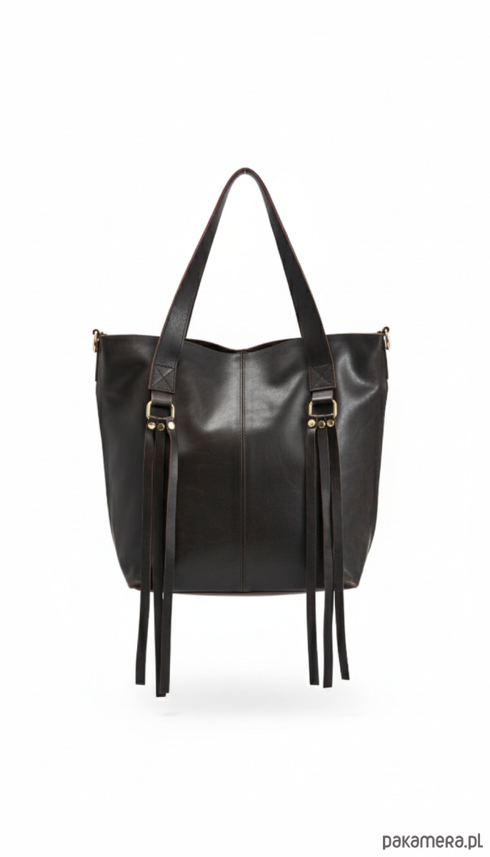 Wyjątkowa torebka damska wykonana w 100% z naturalnej, miękkiej skóry w kolorze głębokiego brązu to doskonały wybór dla kobiet ceniących luksus i trwałość. Klasyczna sylwetka typu shopper została ozdobiona eleganckimi frędzlami i detalami ze złotymi okuciami, które podkreślają niepowtarzalny charakter produktu. Torebka wyposażona jest w długie uchwyty oraz dodatkowy, regulowany pasek na ramię, dzięki czemu możesz nosić ją tak, jak lubisz. Na tylnej stronie znajduje się praktyczna kieszonka na zamek - idealna na klucze lub telefon.