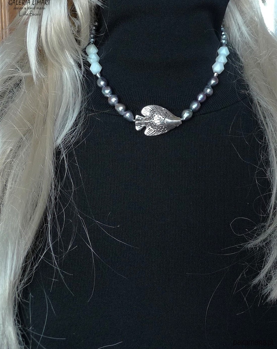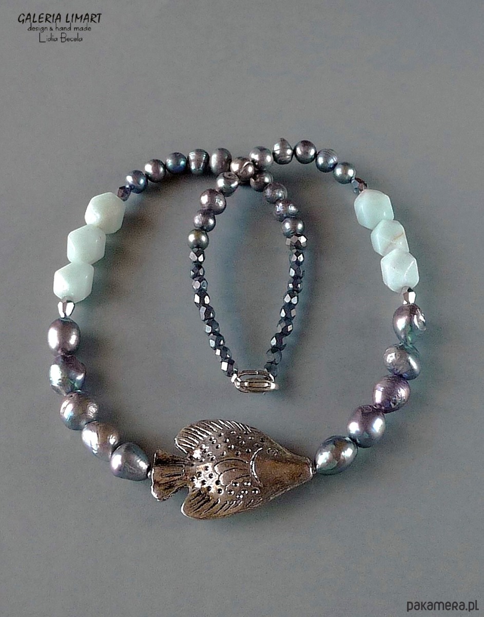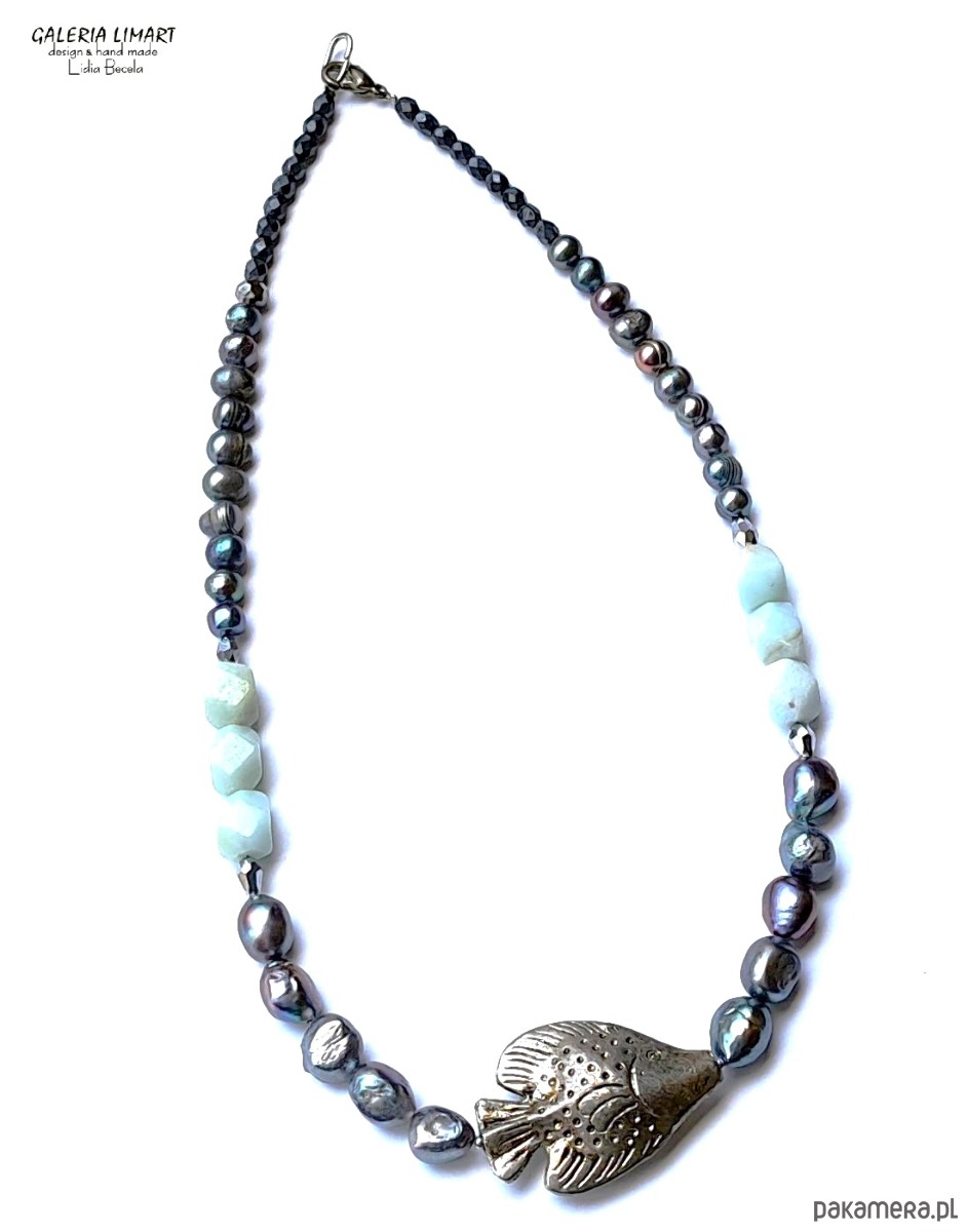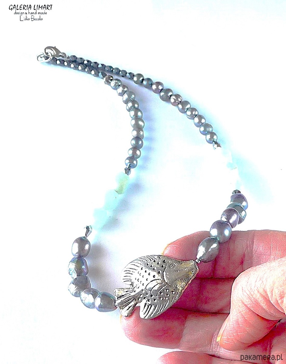 Moja autorska ekskluzywna kompozycja niezwykłego naszyjnika z pięknych prawdziwych szarych pereł z pięknym tęczowym overtonem, 6 dużych (10x8mm) prawdziwych fasetowanych akwamarynów i czeskich kryształków. Centralnie wkomponowana została metalowa ryba. Ryba ma bogatą symbolikę. Kojarzy się przede wszystkim z życiem, płodnością i obfitością. Ale ryba to również symbol czystości, ofiary, mądrości i wiedzy.(dane z netu).