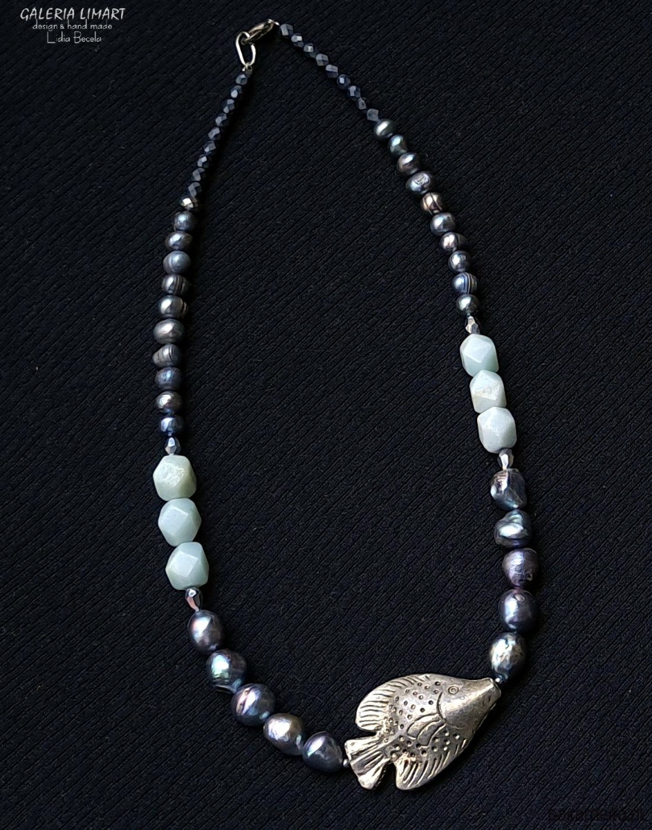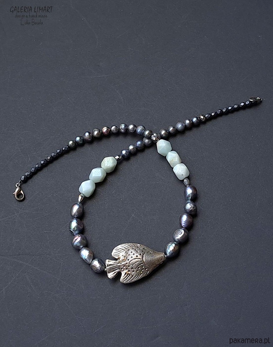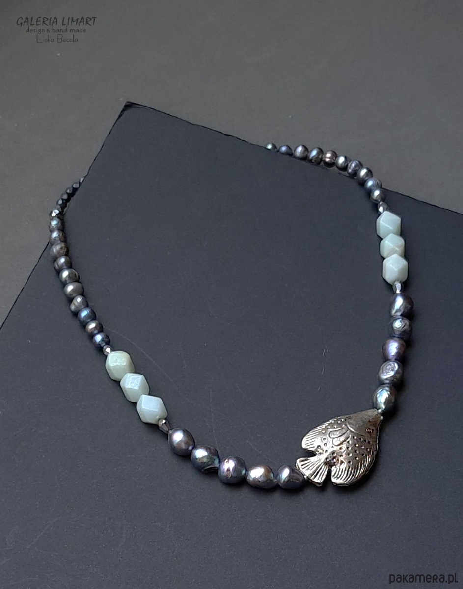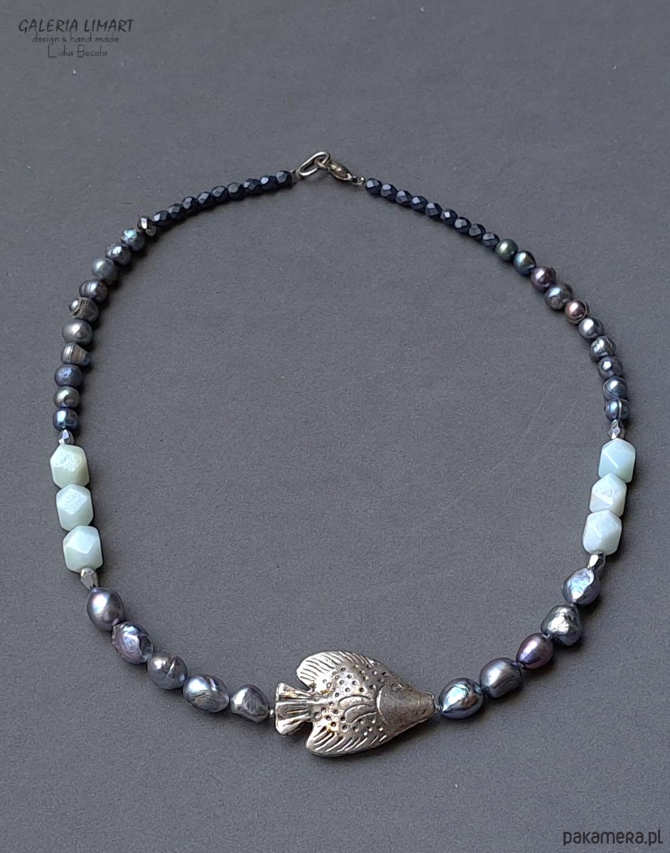 Moja autorska ekskluzywna kompozycja niezwykłego naszyjnika z pięknych prawdziwych szarych pereł z pięknym tęczowym overtonem, 6 dużych (10x8mm) prawdziwych fasetowanych akwamarynów i czeskich kryształków. Centralnie wkomponowana została metalowa ryba. Ryba ma bogatą symbolikę. Kojarzy się przede wszystkim z życiem, płodnością i obfitością. Ale ryba to również symbol czystości, ofiary, mądrości i wiedzy.(dane z netu).