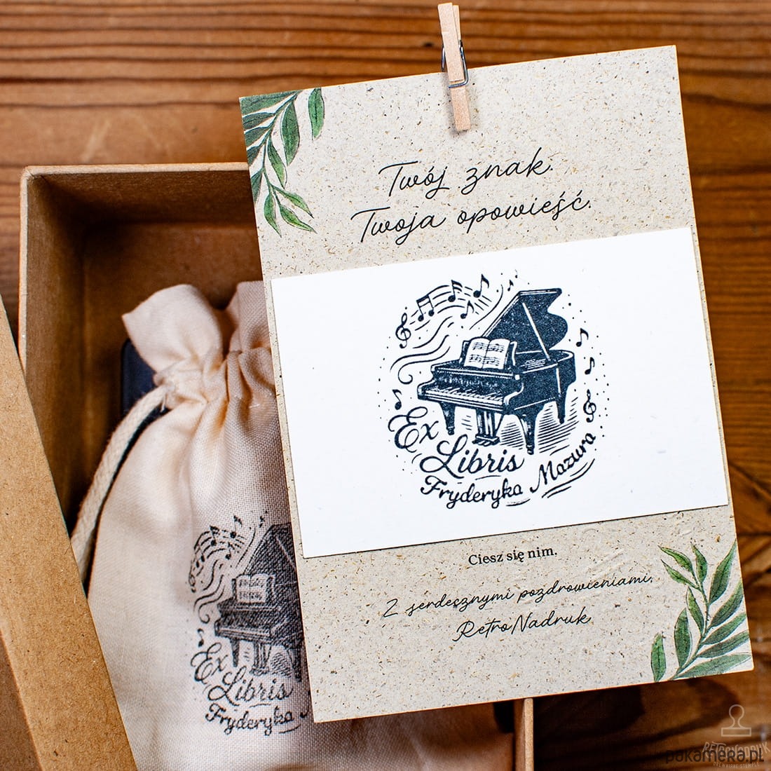 Muzyczny stempel ex libris z motywem fortepianu w zestawie na prezent dla miłośników książek i muzyki. Ekslibris spersonalizowany imieniem i nazwiskiem posiadacza domowej biblioteczki do oznaczania własnych książek lub na oryginalny prezent dla miłośnika książek.
