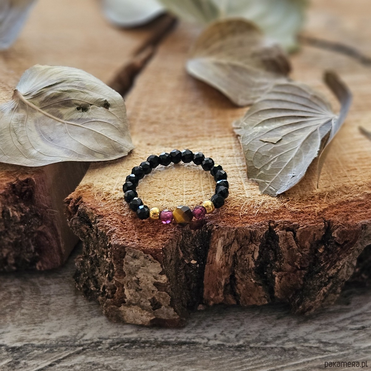 Elastyczny pierścionek z onyksem, granatem i tygrysim okiem
