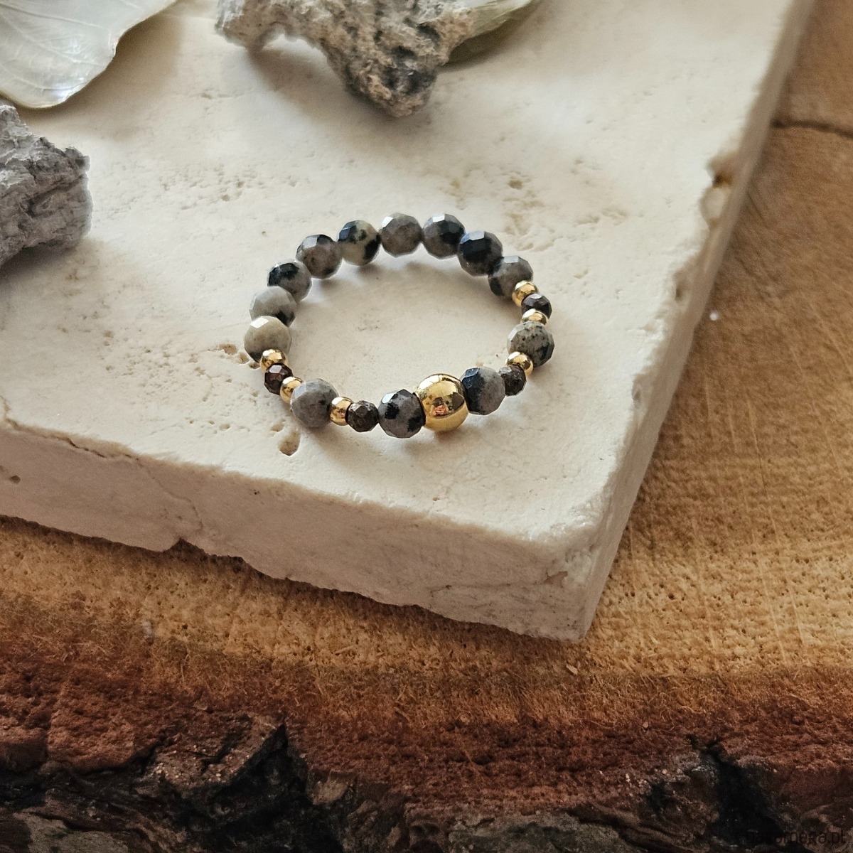 Elastyczny pierścionek z jaspisem dalmatyńskim - kamieniem, który już od wielu miesięcy króluje w biżuteryjnych trendach. Zachwyca nieregularnymi wzorami, a uzupełniony delikatnym bronzytem i dodatkami ze stali szlachetnej tworzy modny dodatek do każdej stylizacji.
