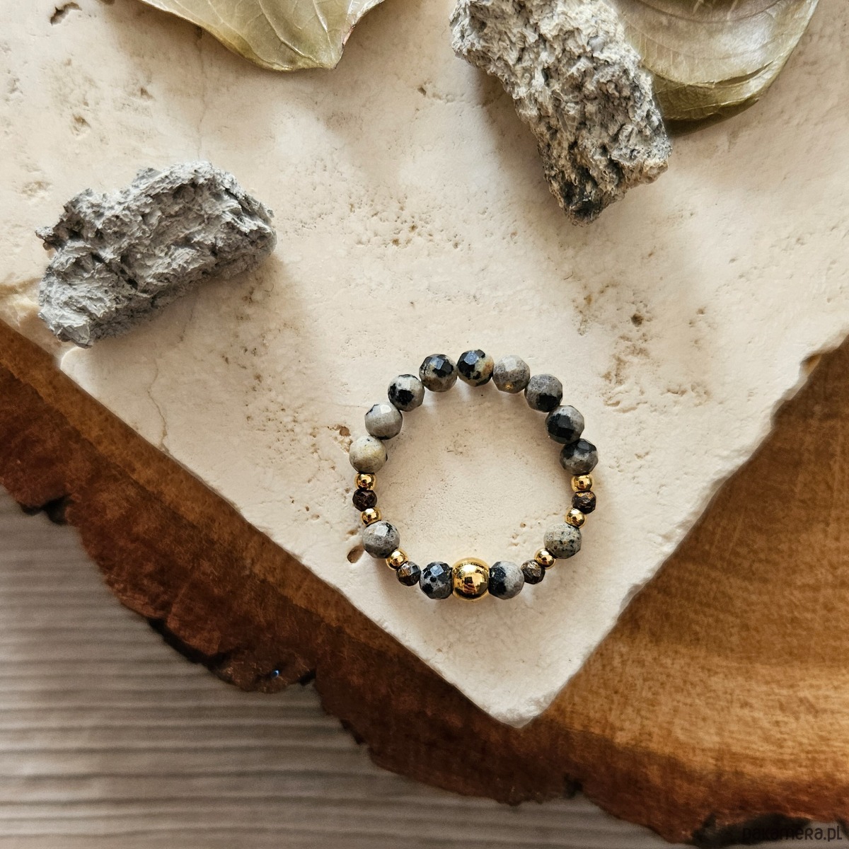 Elastyczny pierścionek z jaspisem dalmatyńskim - kamieniem, który już od wielu miesięcy króluje w biżuteryjnych trendach. Zachwyca nieregularnymi wzorami, a uzupełniony delikatnym bronzytem i dodatkami ze stali szlachetnej tworzy modny dodatek do każdej stylizacji.