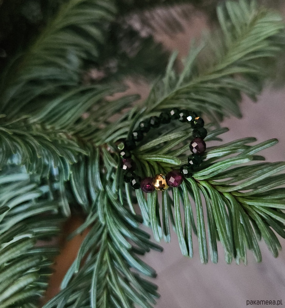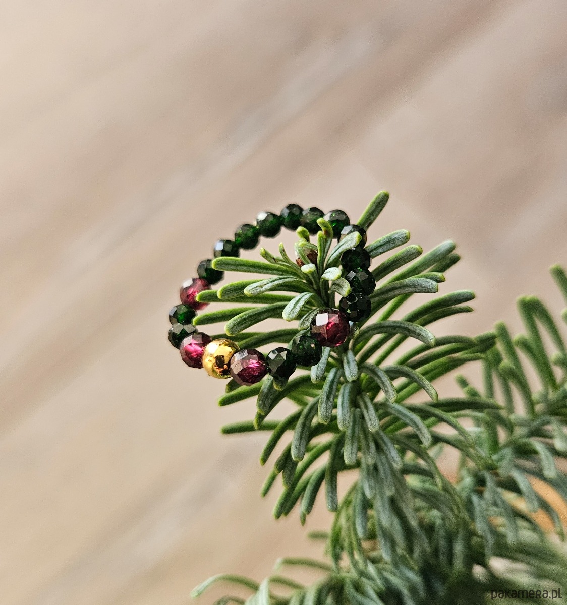 Elegancki pierścionek w głębokich odcieniach bordo i butelkowej zieleni - klasyczne zestawienie, które nie wychodzi z mody. Przepiękną zieleń zapewnia tu szmaragd Nilu, a bordowe akcenty - granat. Oba kamienie szlifowane są fasetowo, dzięki czemu pięknie lśnią na palcu. Całość uzupełniona dodatkiem ze stali szlachetnej w kolorze złotym.