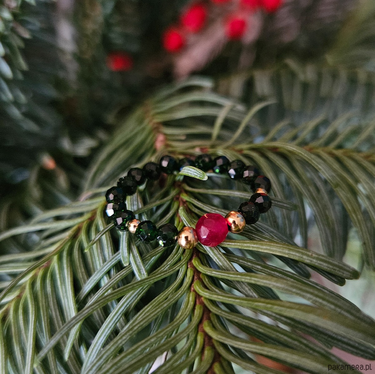 Uroczy pierścionek z kontrastowym oczkiem. Łączy w sobie szmaragd Nilu i jadeit, a więc głęboki odcień butelkowej zieleni oraz soczystą czerwień. Całość uzupełniona dodatkami ze stali szlachetnej w kolorze złotym. Idealny na prezent!