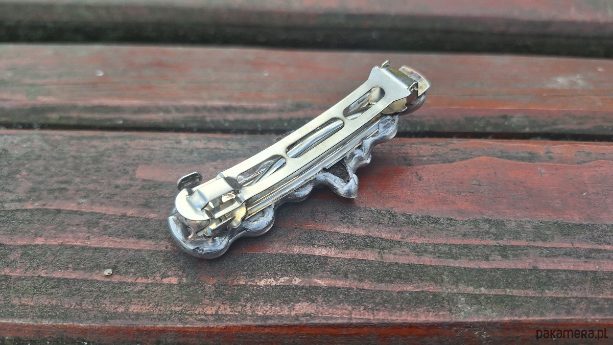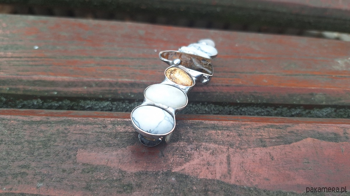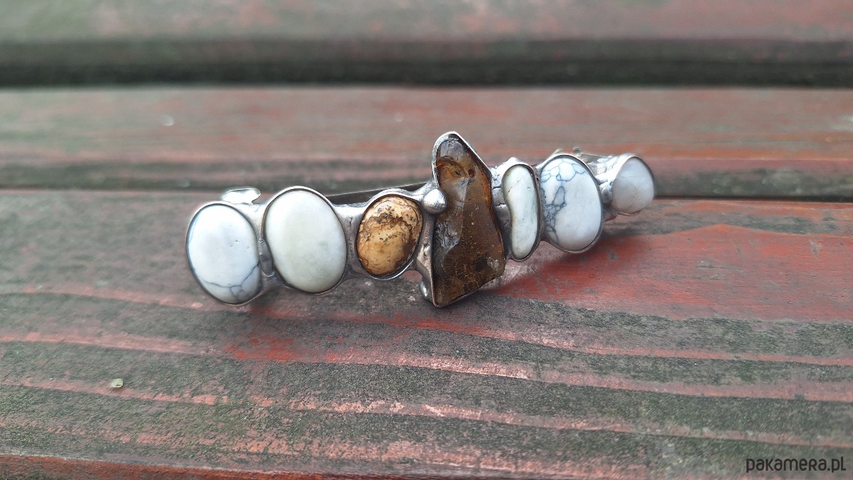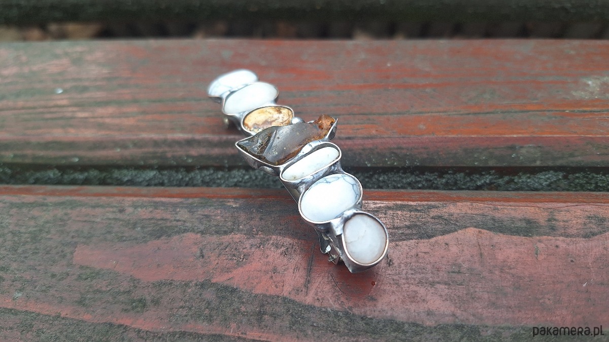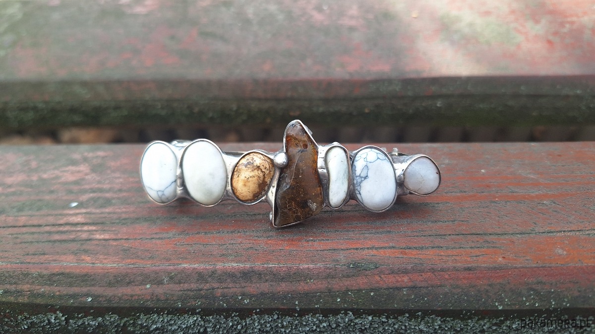 Klamra do włosów, wykonana z miedzi, cyny, bursztynu, jaspisu, howlitów. Wymiary ok. 8 na 2 cm. Zapięcie 6 cm, metalowe.