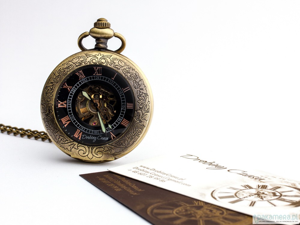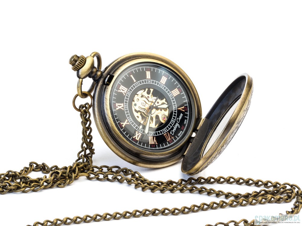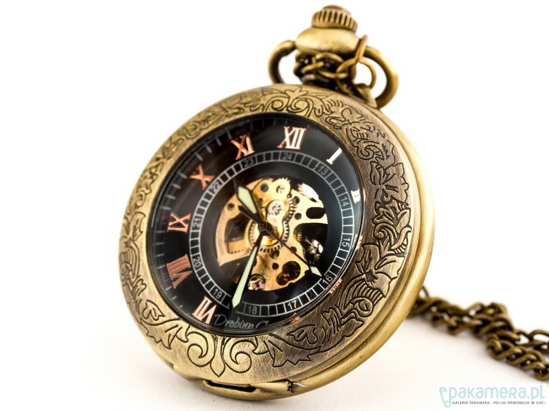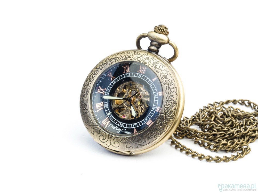 Niełatwo jest zawrzeć w jednej rzeczy wszystko, co czyni twórcę rozpoznawalnym, a przy tym nie zabrnąć na manowce przesady. Elegancja brązu to zegarek wyjątkowy, gdyż jest spełnieniem tego ciężkiego wymagania. Posiadacz tego cacka będzie mógł cieszyć się jednocześnie wszystkim, czym chcemy cieszyć naszych Klientów. Subtelnym, secesyjnym wzorem wieczka. Klasycznymi, rzymskimi cyframi, a zarazem mniejszymi - arabskimi. Możliwością oglądania pracy sprężynowego mechanizmu. Wyraźnymi, fluorescencyjnymi wskazówkami gwarantującymi wygodne korzystanie. Jeśli oglądając nasze prace masz problem z dokonaniem wyboru i marzysz o zegarku, który ma w sobie po trosze wszystkiego - to "Elegancja brązu" jest właśnie dla Ciebie.