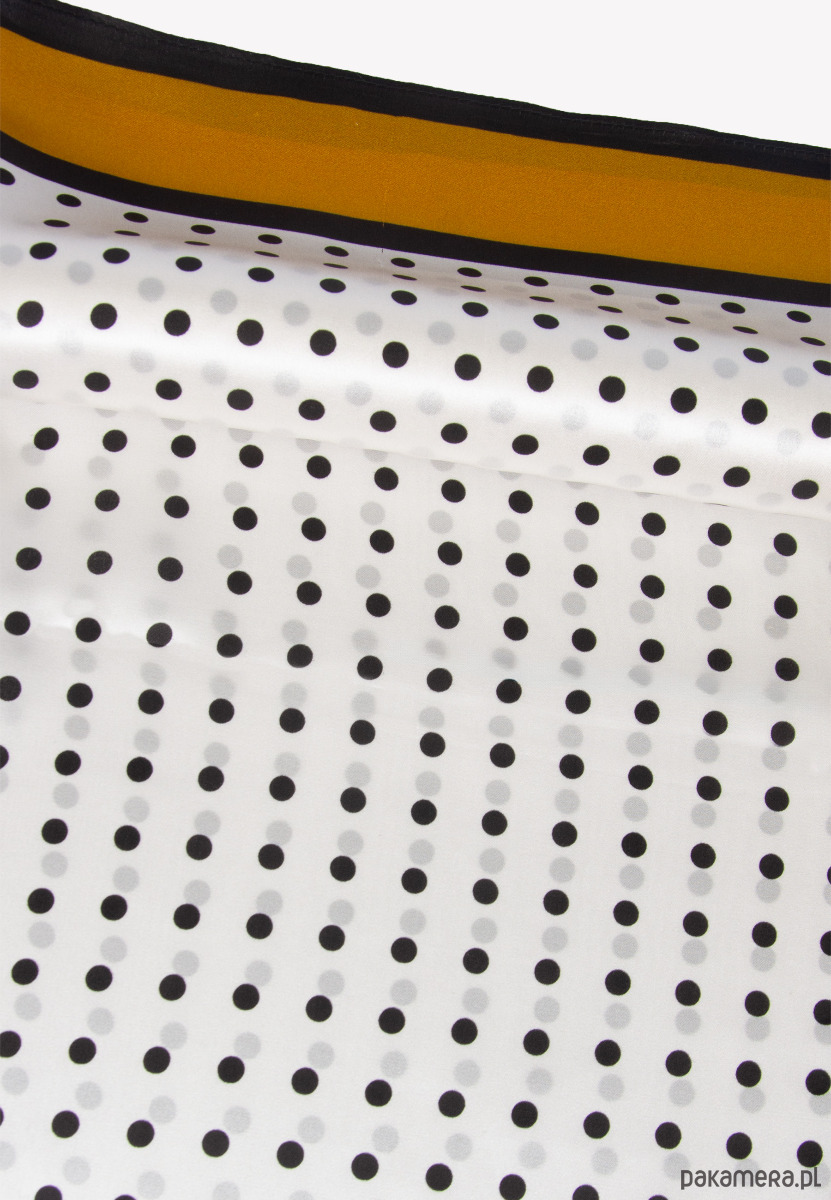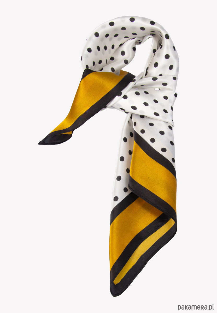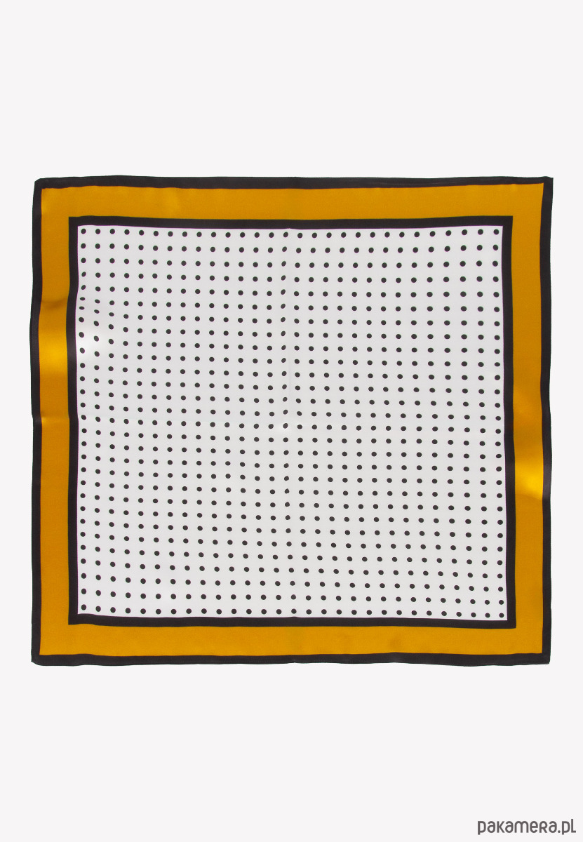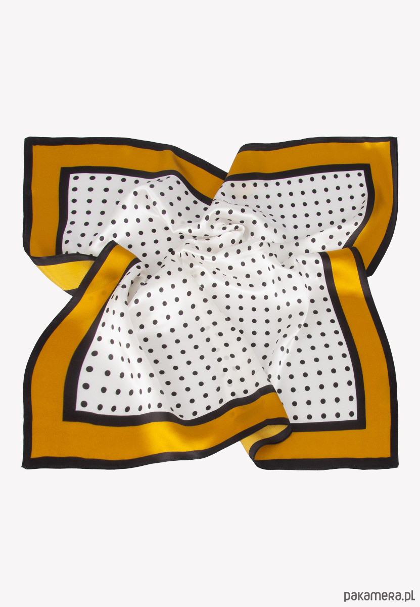 Subtelna elegancja w klasycznym wydaniu – ta jedwabna apaszka łączy ponadczasowy wzór kropek z wyrazistą, złocistą ramką, tworząc kompozycję pełną szyku i charakteru. Kontrastowe połączenie bieli, czerni i ciepłego bursztynu sprawia, że dodatek ten doskonale podkreśli zarówno codzienne stylizacje, jak i wieczorowe zestawy. Idealna dla kobiet, które cenią sobie klasykę z nutą nowoczesności. Noś ją z prostą koszulą, lekkim swetrem lub eleganckim płaszczem, by dodać stylizacji wyrafinowanego akcentu.