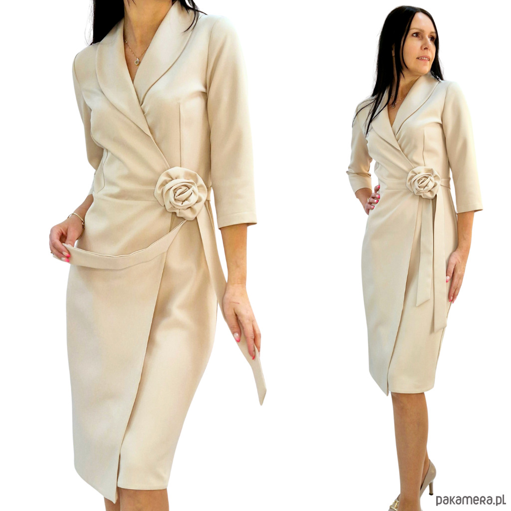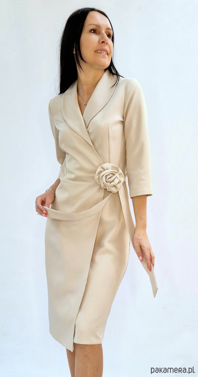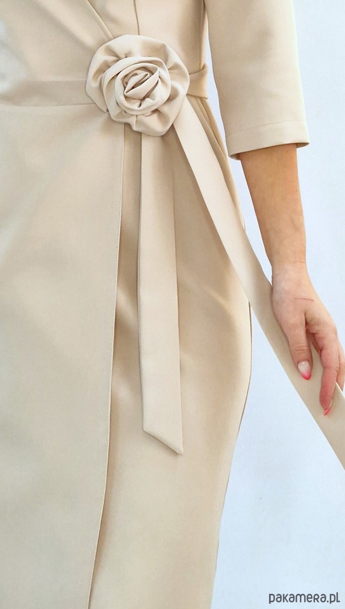 Elegancka beżowa Kopertowa sukienka z różą