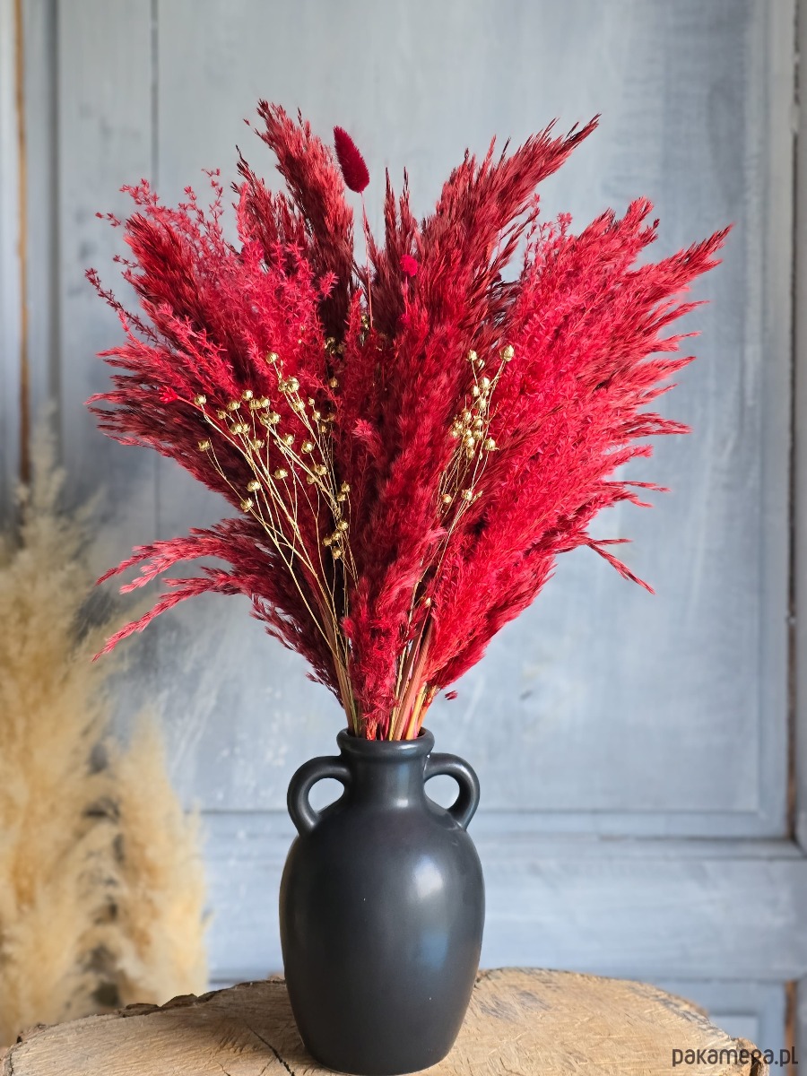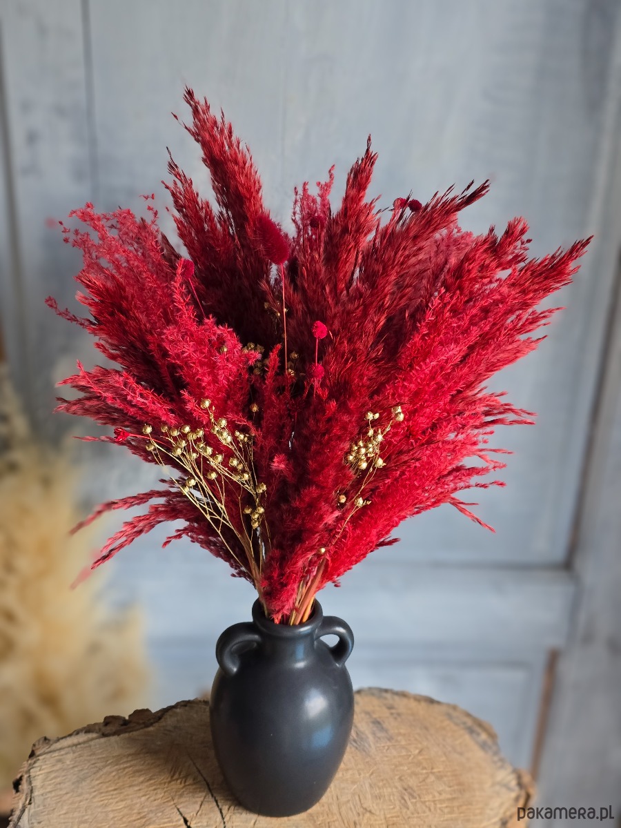 Ten bukiet z traw pampasowych i suszonych kwiatów łączy naturalność z elegancją, tworząc efektowną ozdobę, która przyciąga wzrok i dodaje wnętrzu luksusowego charakteru. Doskonale sprawdzi się jako całoroczna dekoracja lub świąteczna ozdoba.