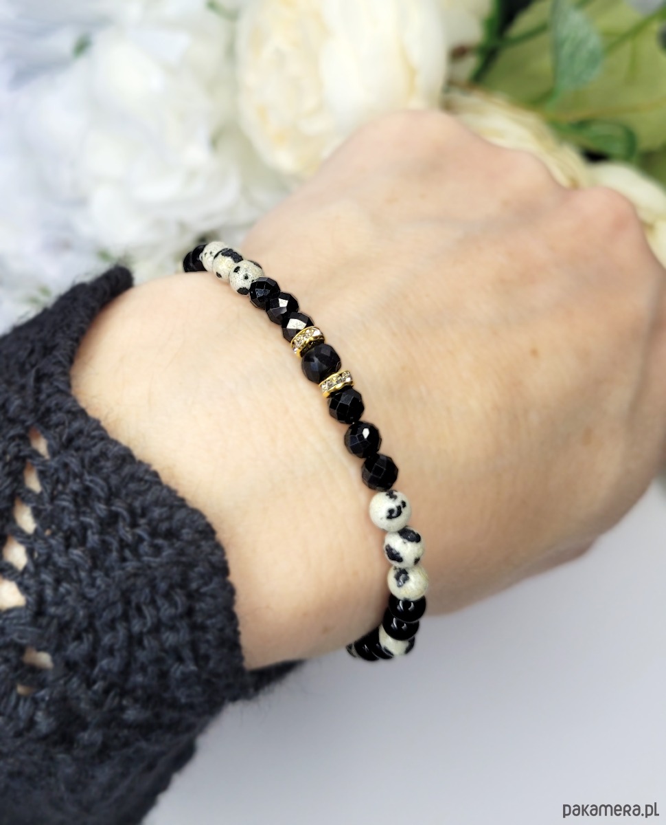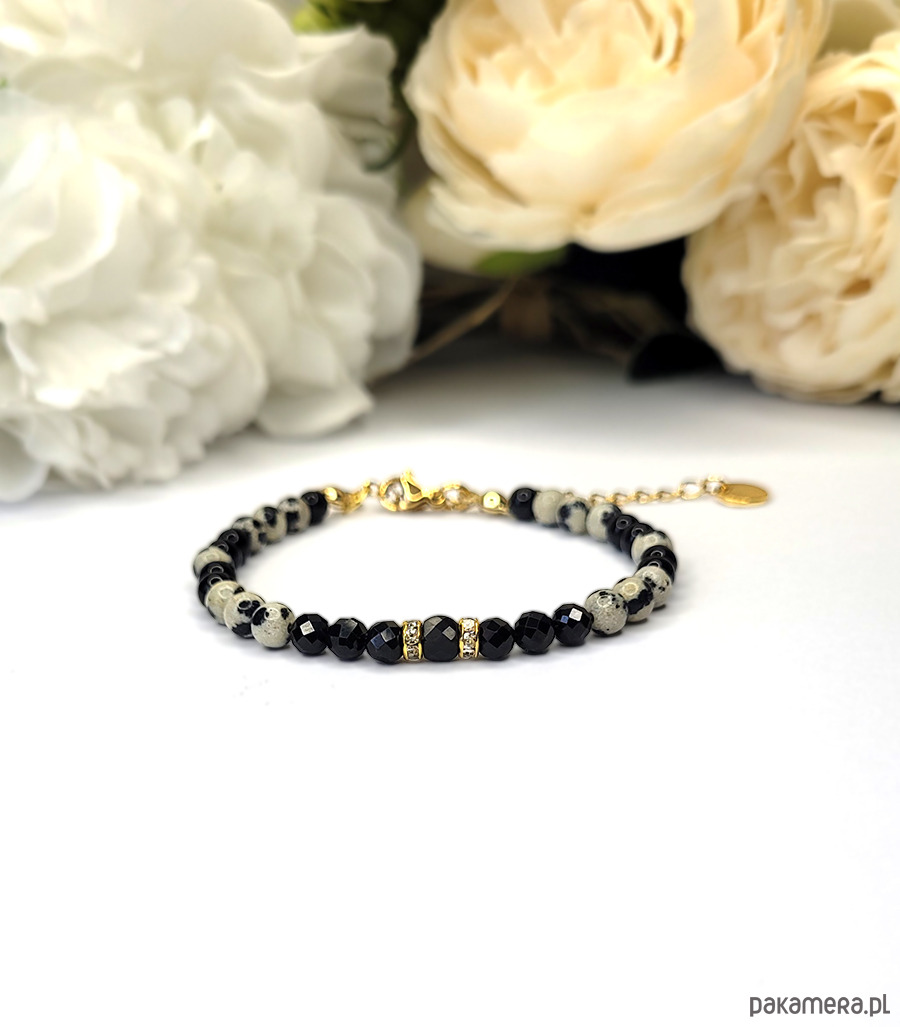 Piękna elegancka bransoletka zrobiona z kamieni naturalnych: Turmalinu, Jaspisu dalmatyńskiego, Spinelu oraz Onyksu.