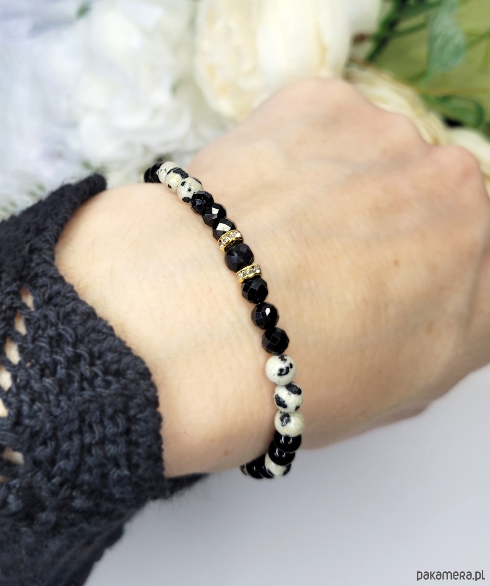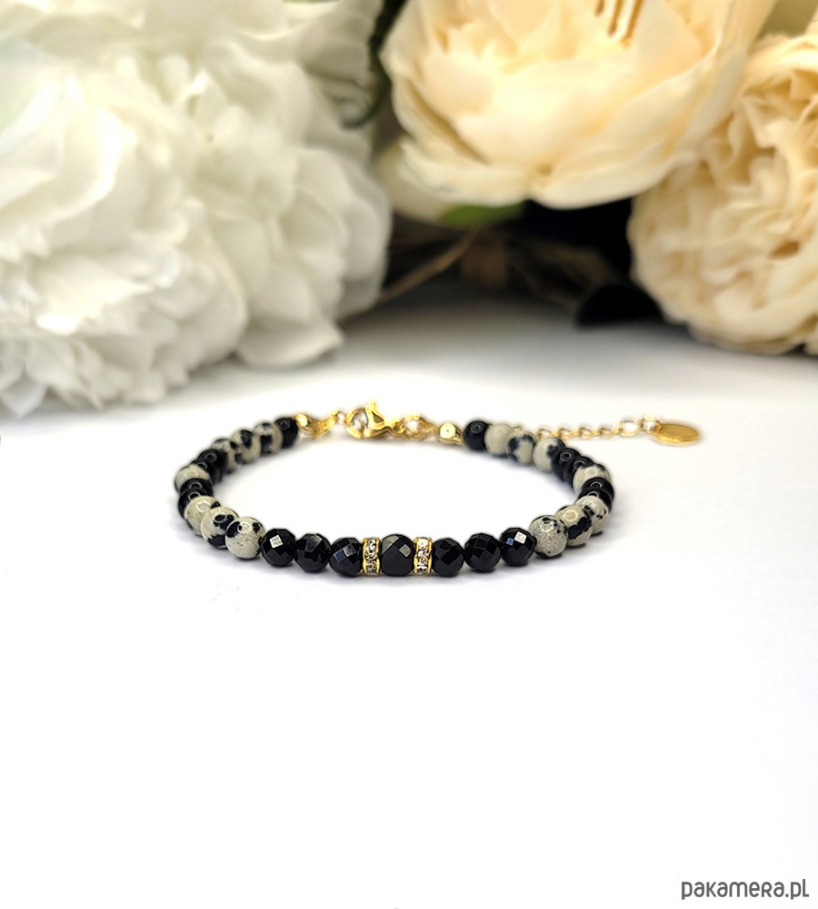 Piękna elegancka bransoletka zrobiona z kamieni naturalnych: Turmalinu, Jaspisu dalmatyńskiego, Spinelu oraz Onyksu.