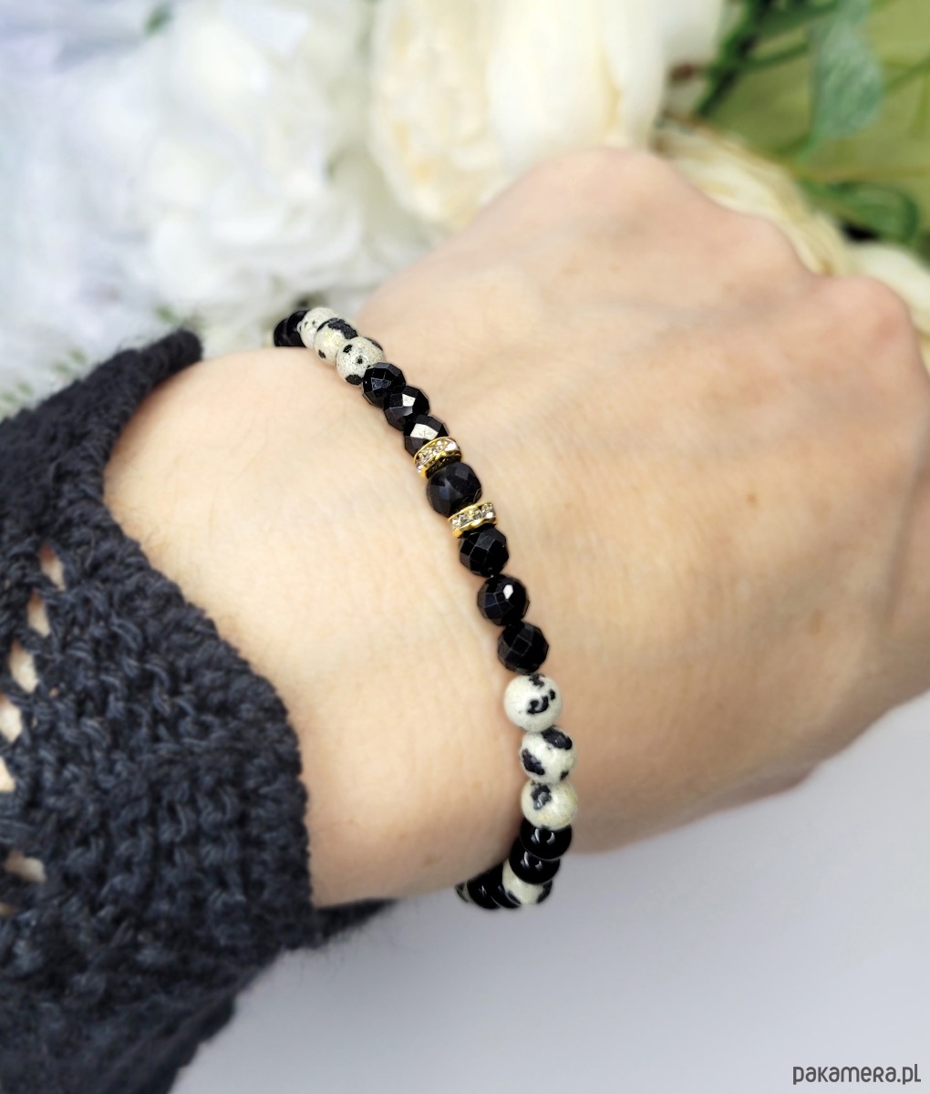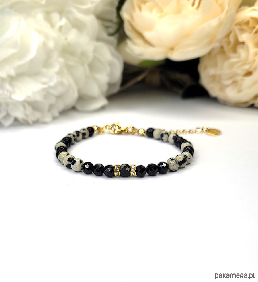 Piękna elegancka bransoletka zrobiona z kamieni naturalnych: Turmalinu, Jaspisu dalmatyńskiego, Spinelu oraz Onyksu.