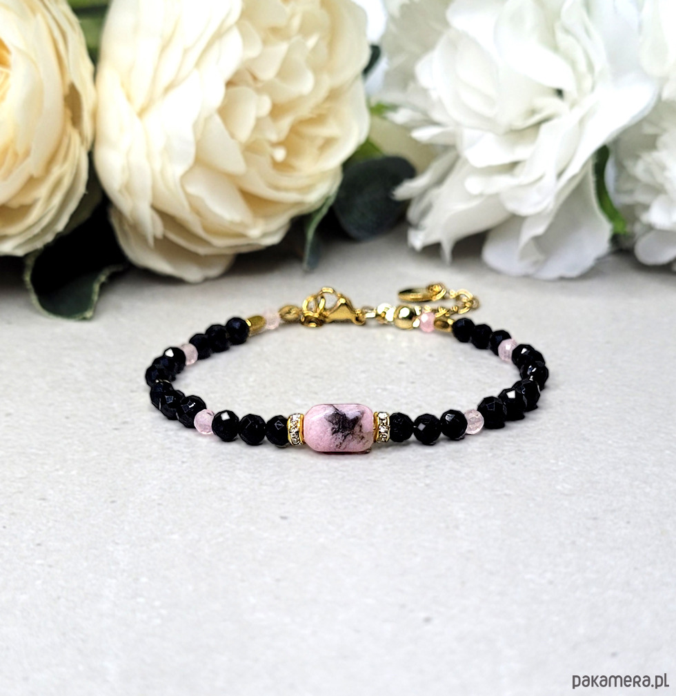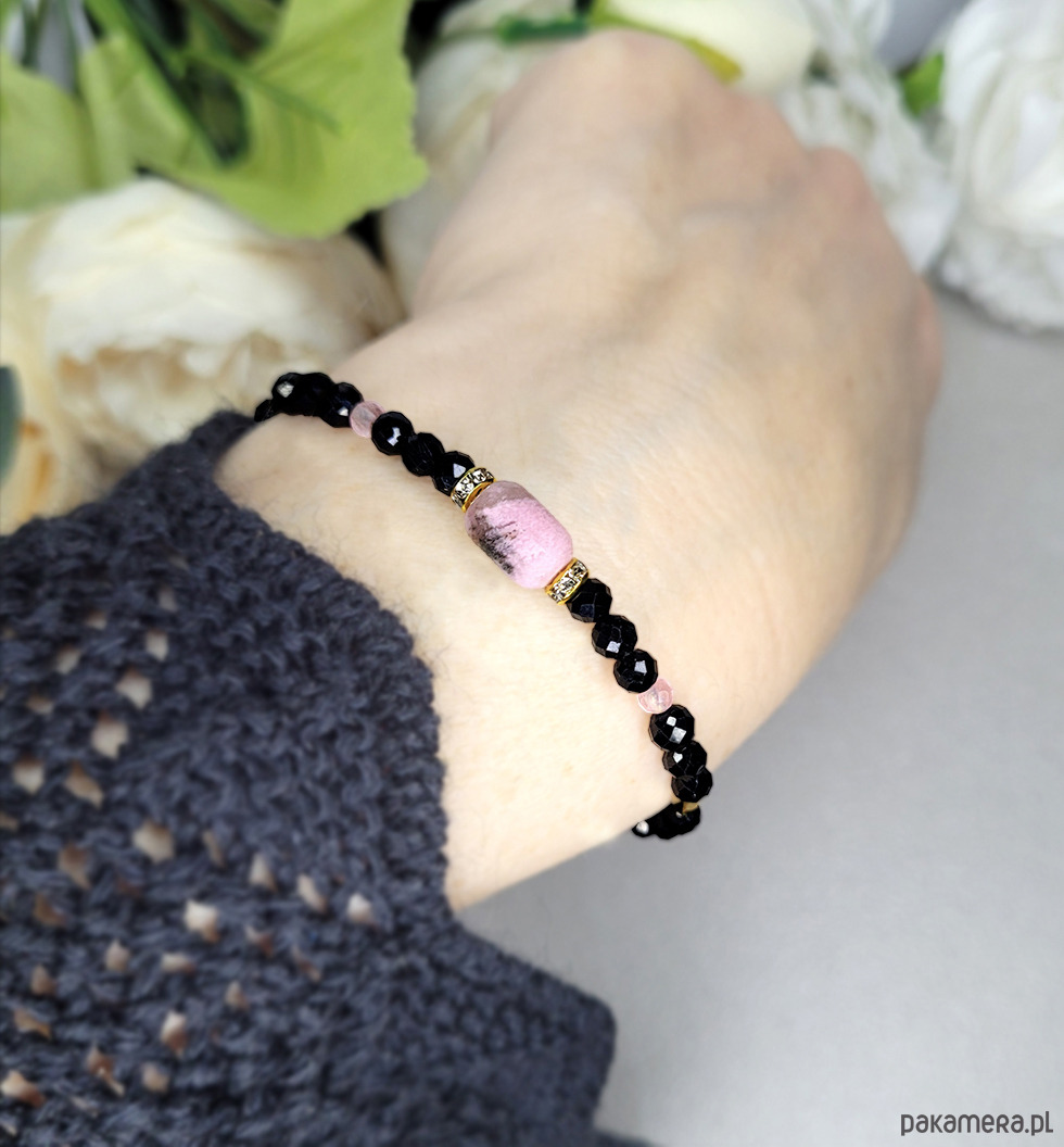 Jedyny egzemplarz- piękna elegancka bransoletka zrobiona z kamieni naturalnych: Turmalinu, Rodonitu, Kwarcu różowego, Spinelu oraz Hematytu.