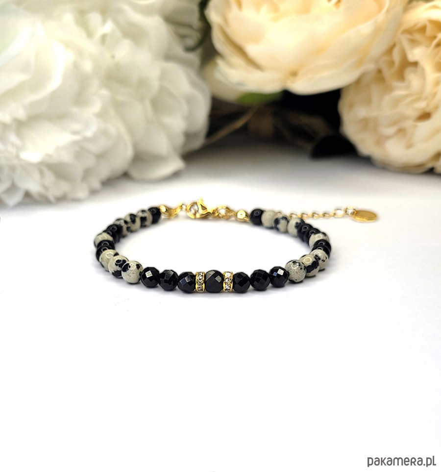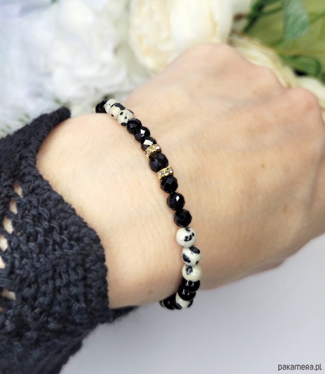 Piękna elegancka bransoletka zrobiona z kamieni naturalnych: Turmalinu, Jaspisu dalmatyńskiego, Spinelu oraz Onyksu.